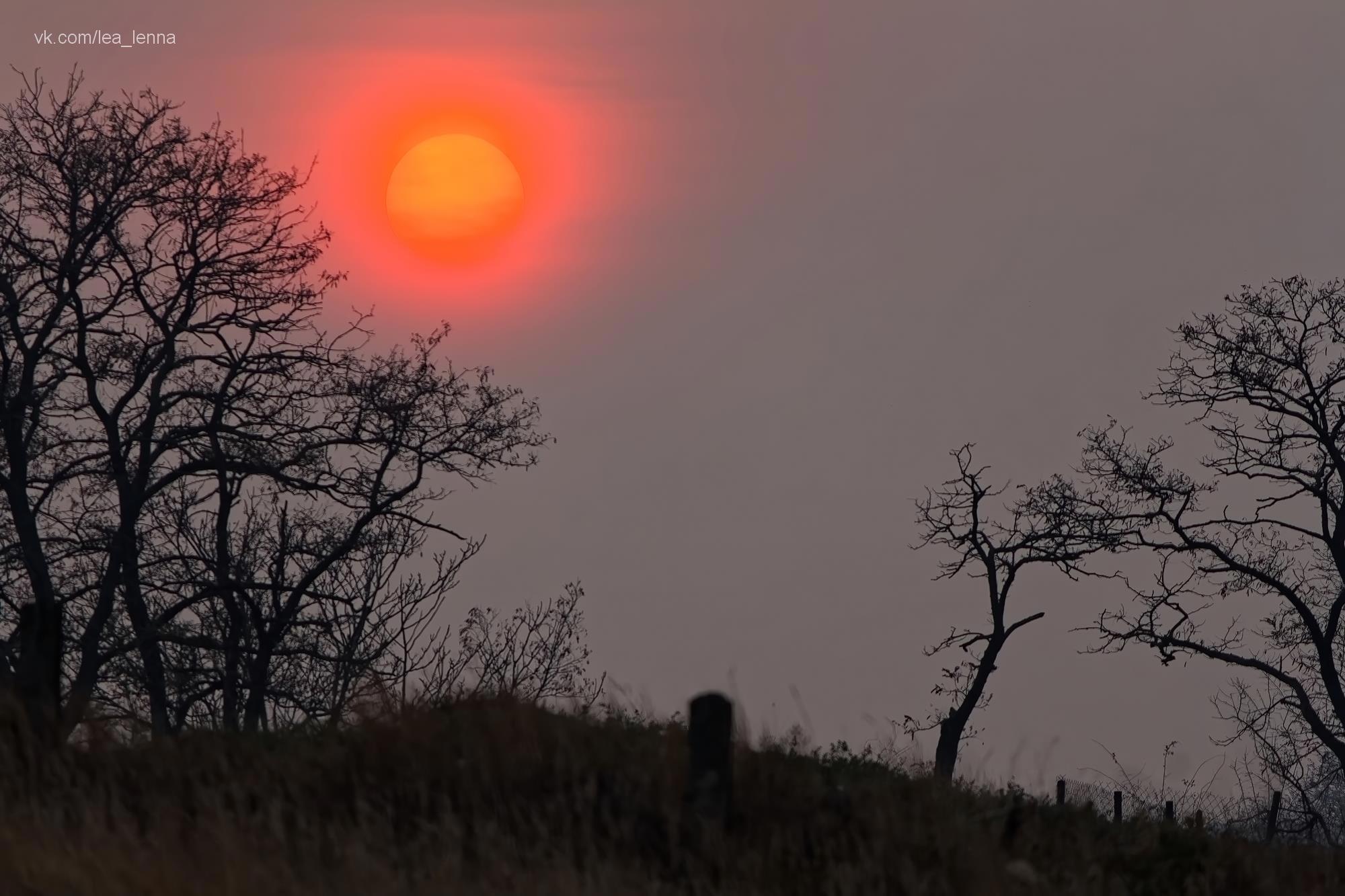 На вечерней картинке все же явлено солнце, прикрытое туманной дымкой. С дневным светилом так же, как с луной - свет его чаще так ярок, что фотокамера засвечивает то, что глазу кажется оранжевым или желтым шаром. Но иногда туман или дымка смягчают интенсивность, тогда на картинке есть и пейзаж и солнце.