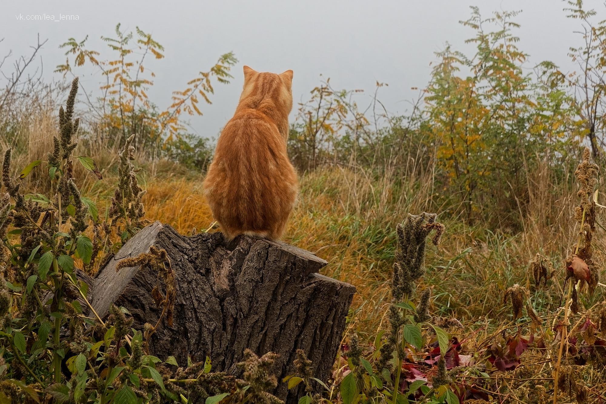 Рыжий котик украшает собой пасмурный день и видно, как прекрасны и разноцветны травы.
