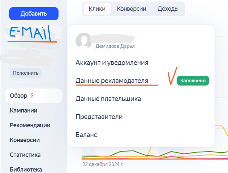 Для начала тыкнем в левом поле на свой логин, во всплывающем окне тыкаем на Данные рекламодателя. Там заполняем ИНН, ФИО, контакты. Я физик, так что все просто, что надо для юриков, я не знаю. Это надо для автоматического формирования отчета для передачи в ЕРИР по новому закону о рекламе.