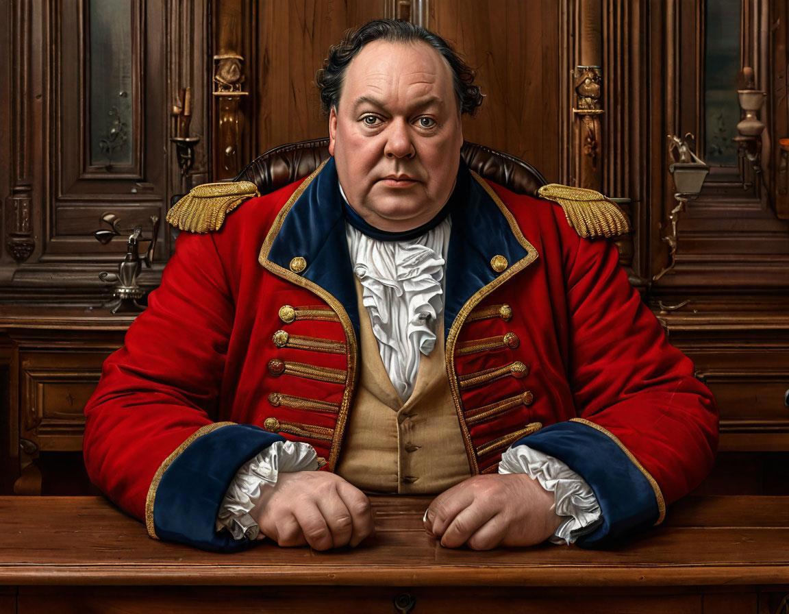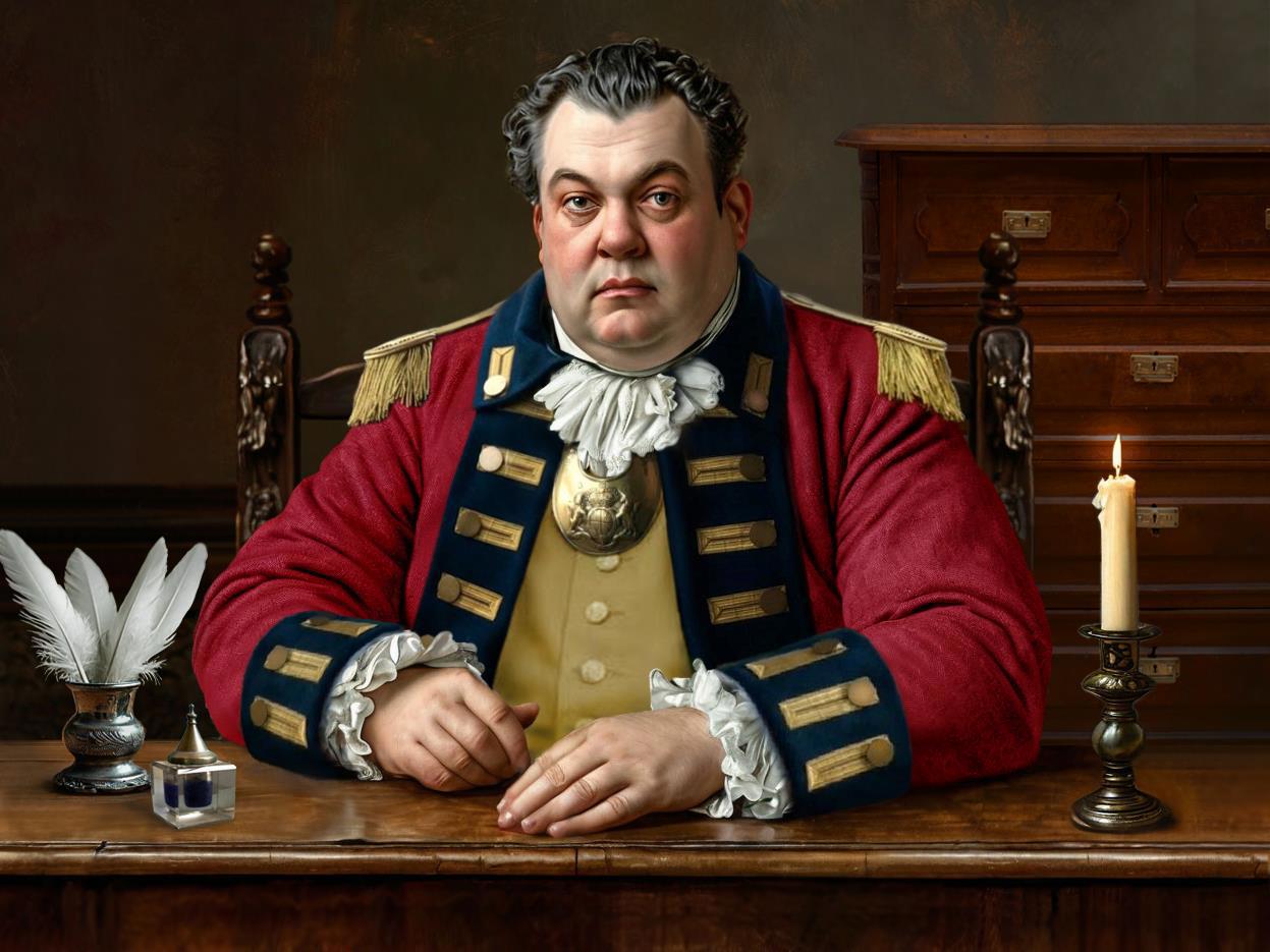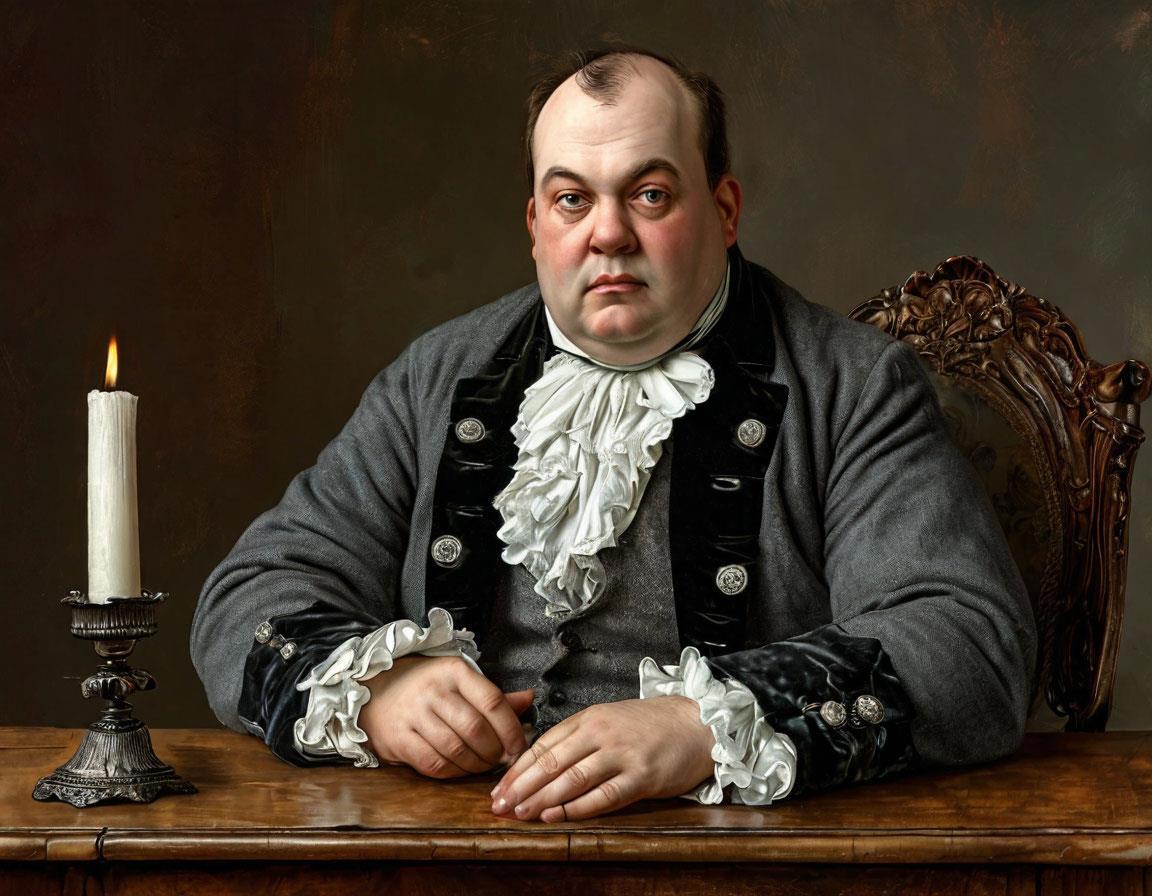 Запрос был такой: полный мужчина сорока лет с одутловатым лицом с серыми глазами и зачёсанными назад тёмными волосами в сером сюртуке с металлическими пуговицами, черном жилете и белой рубашке с оборками на манжетах, узком белом шейном платке сидит в высоком кресле за деревянным столом, положив на него руки. На столе подсвечник со свечкой, чернильница и стаканчик с гусиными перьями.