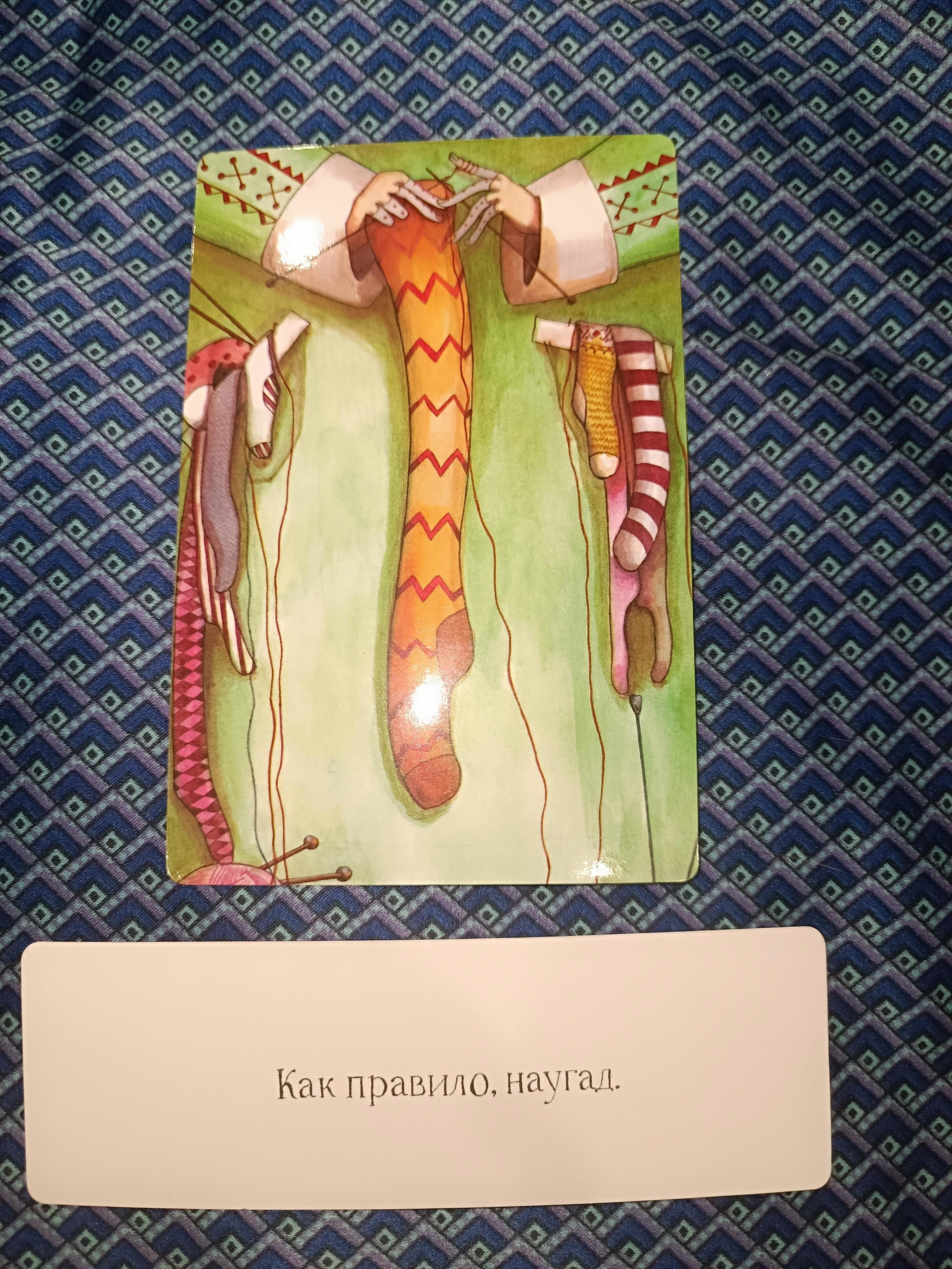 — Обычно я вытягиваю карту с мыслями о творческом пути автора, но тут что-то необычное. Смотрите, возможно, эти смешные вязанные носочки и гольфы — ваши истории. Вы пишете, сплетаете, вывязываете их. Они разные, короткие и длинные, разноцветные, узорчатые. Но главное, что процесс идёт в удовольствие. И пусть писательство как можно дольше будет в радость вам.