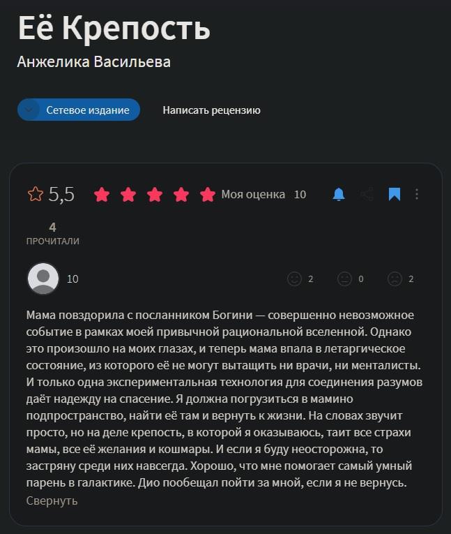 Автор: Анжелика ВасильеваВозможно, это звучит слишком громко, ведь комментариев она не писала, но единички на Лайвлибе ставит, может после этого поста найдёт ещё новую книгу и туда тоже поставит.