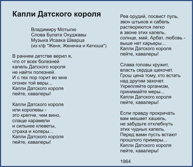 Автор: Доминика и Николай Шамрай— Что такое «Капли датского короля?» — прозвучал неожиданный вопрос. Он всплыл по вполне понятным причинам, по Ретро-каналу звучала песня Окуджавы с одноименным названием.