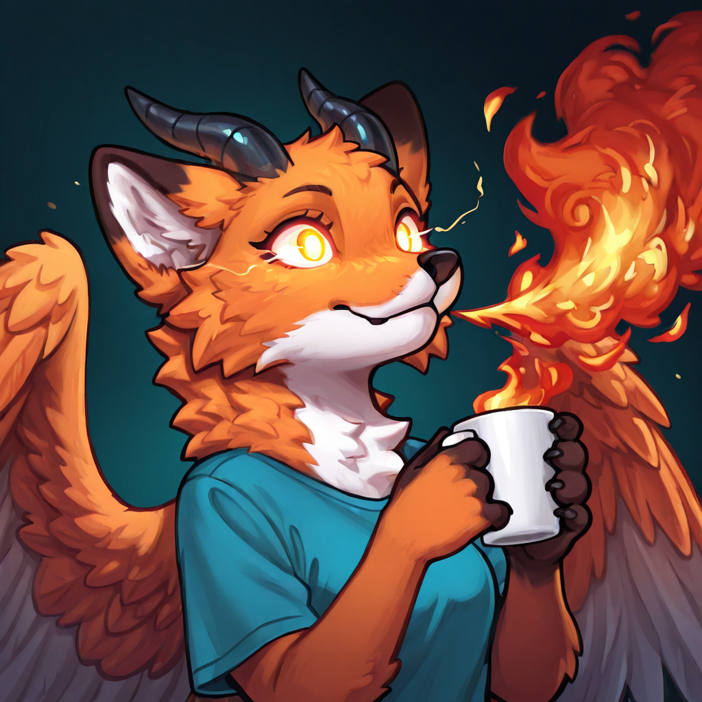 1girl, female, solo, fox, furred dragon, breathing fire, ginger fur, 2 horns, feathered wings, holding cup, shirt, glowing eyes