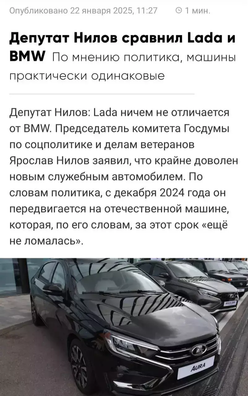 Депутат Ярослав Нилов уже целый месяц ездит на отечественном автомобиле, и он даже ни разу не заглох! «У машины есть бортовой навигационный компьютер, автоматическая коробка переключения передач», — отметил депутат! Лично я верю в то, что такое вполне возможно! Наверняка помогли братья по разуму!