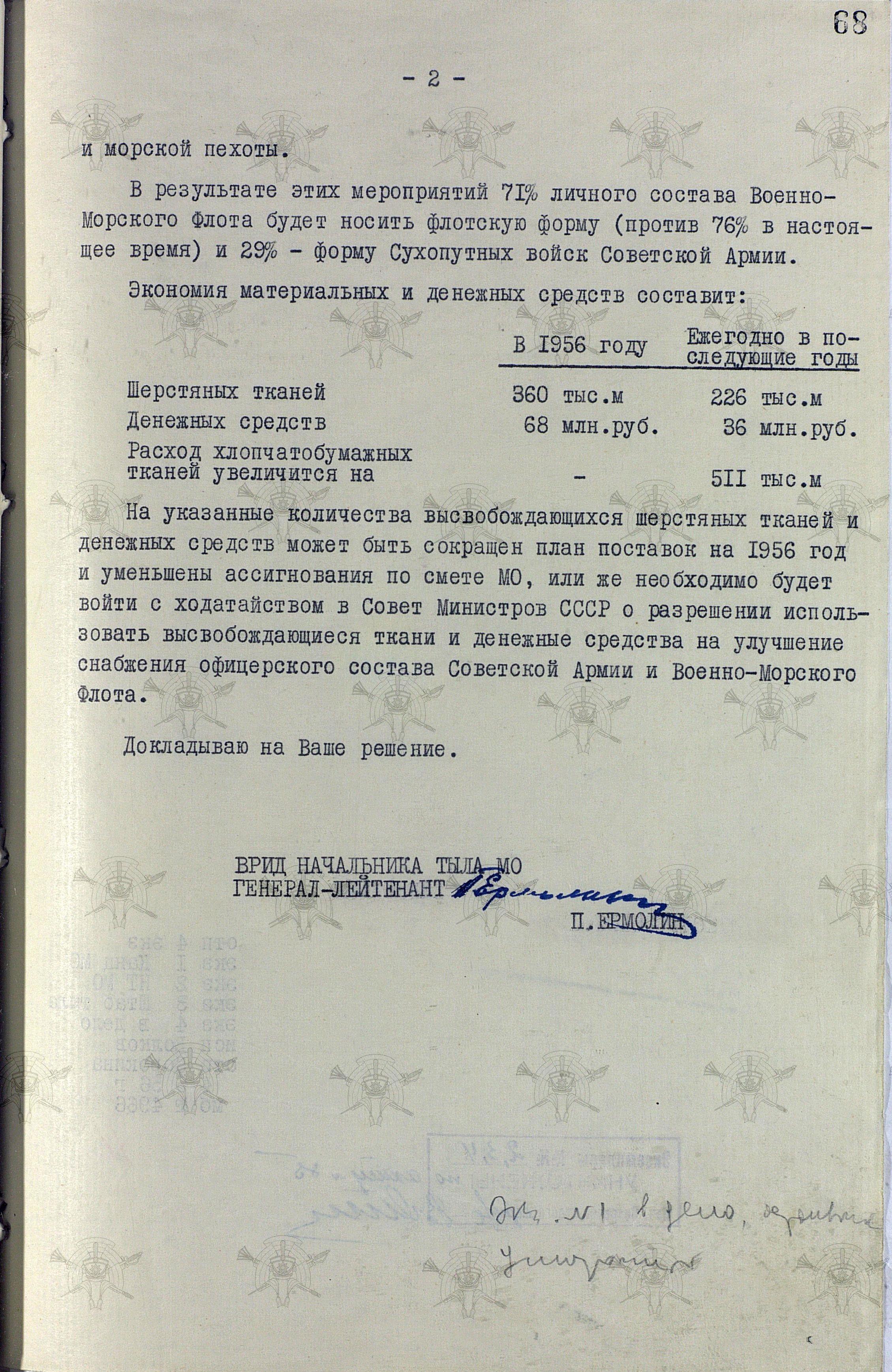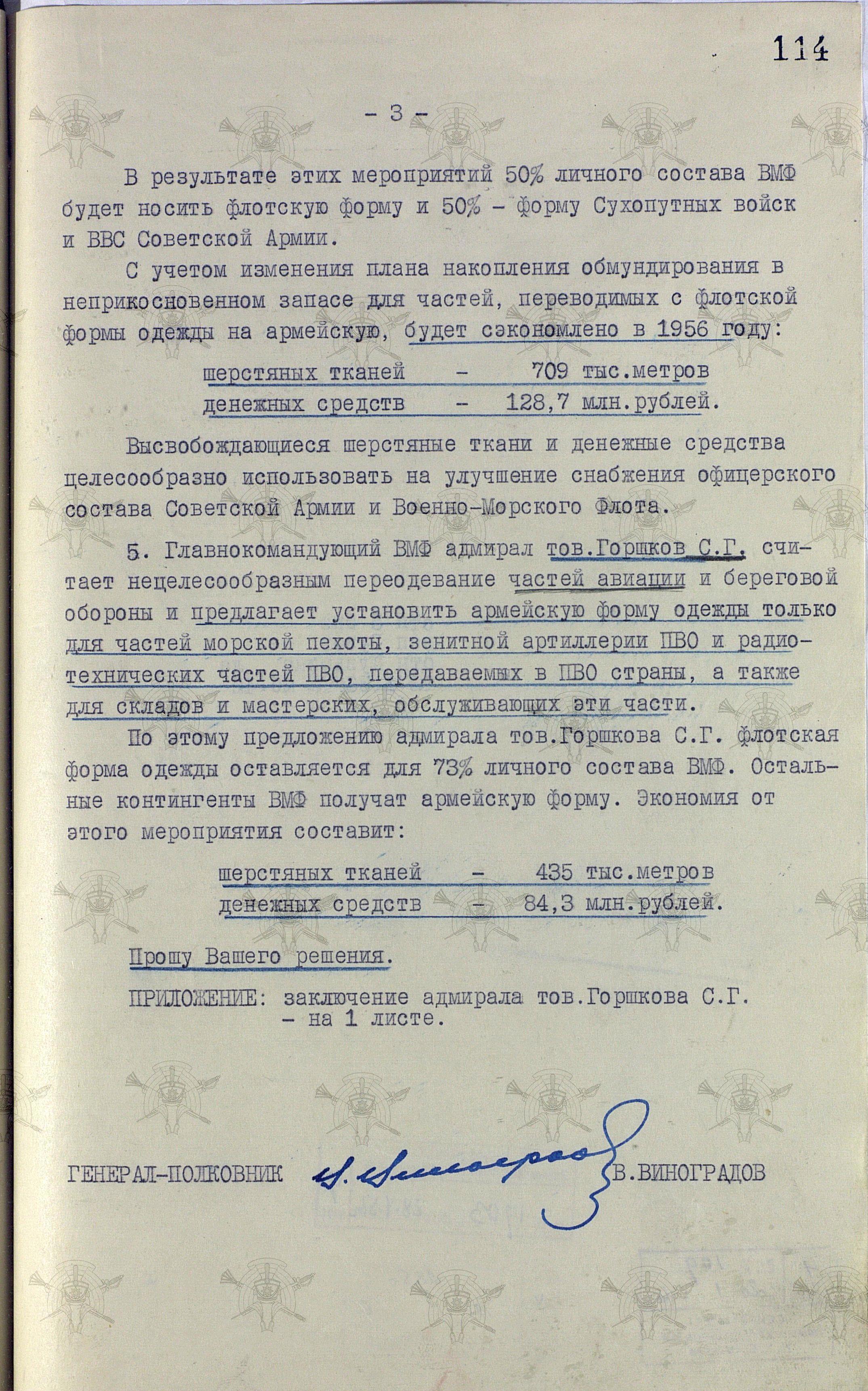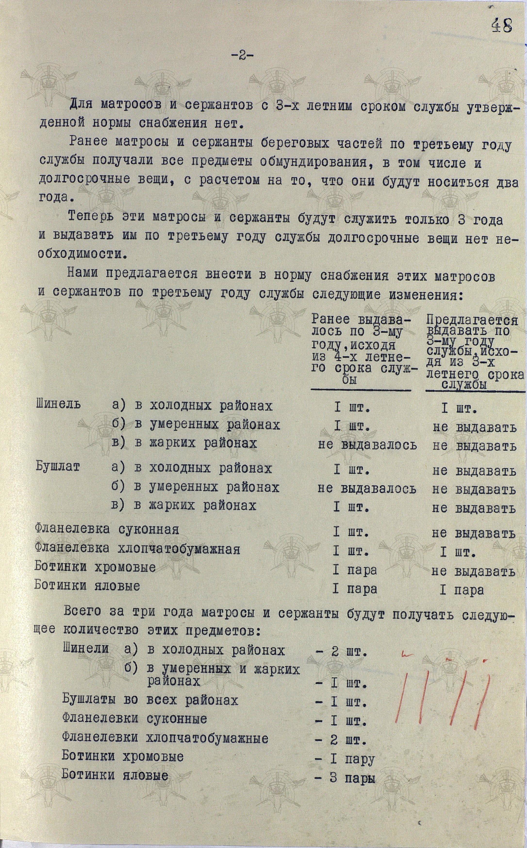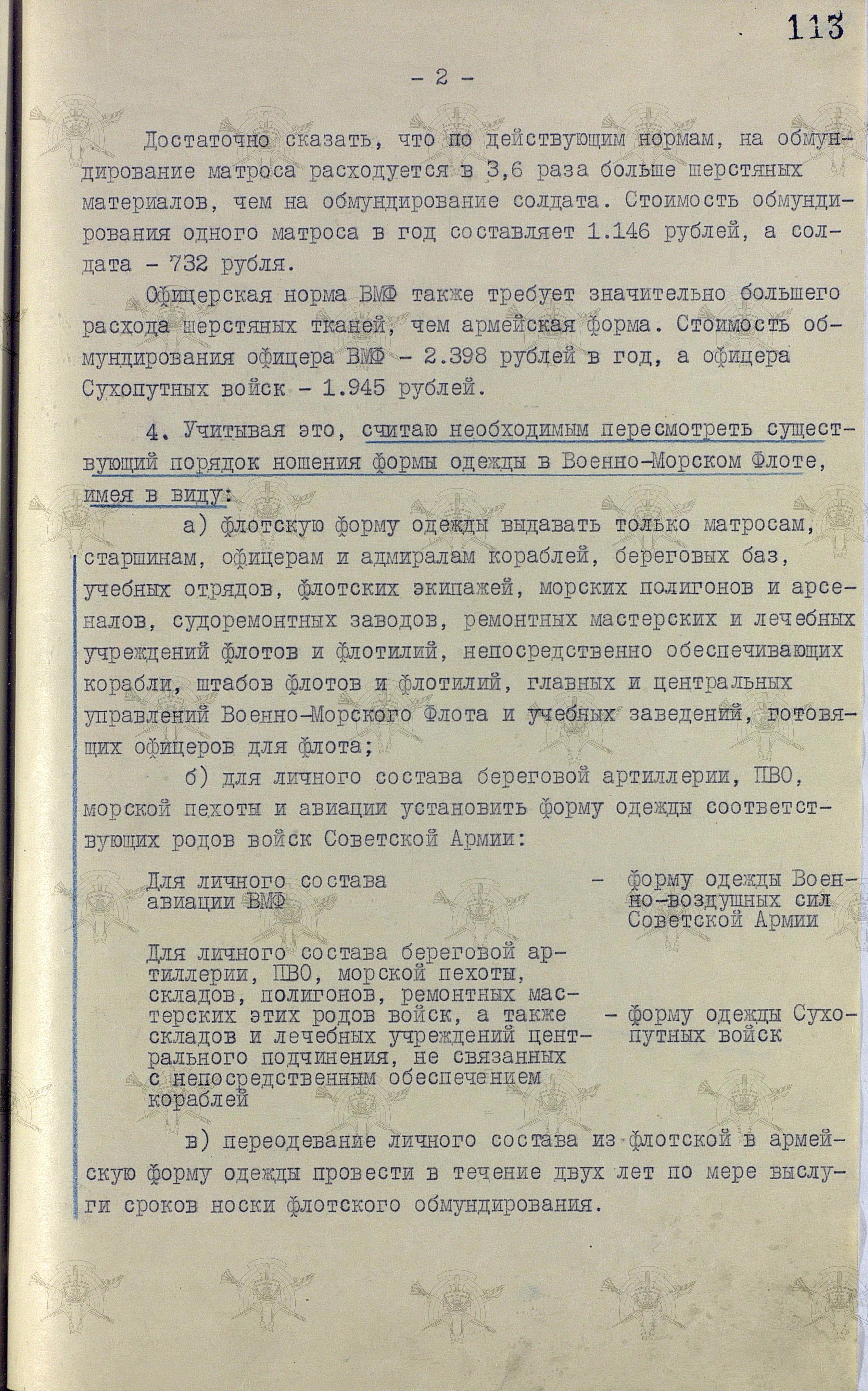 Любопытен третий пункт доклада, который похоже раскрывает подоплёку не желания командования ВМФ увеличивать количество личного состава, получающего армейскую форму, пропорционально уменьшая численность тех, кому полагалась флотская. Всё дело в «богатстве» флотских норм, в лучшем качестве одежды и обуви, ну ещё и красота, наверное.