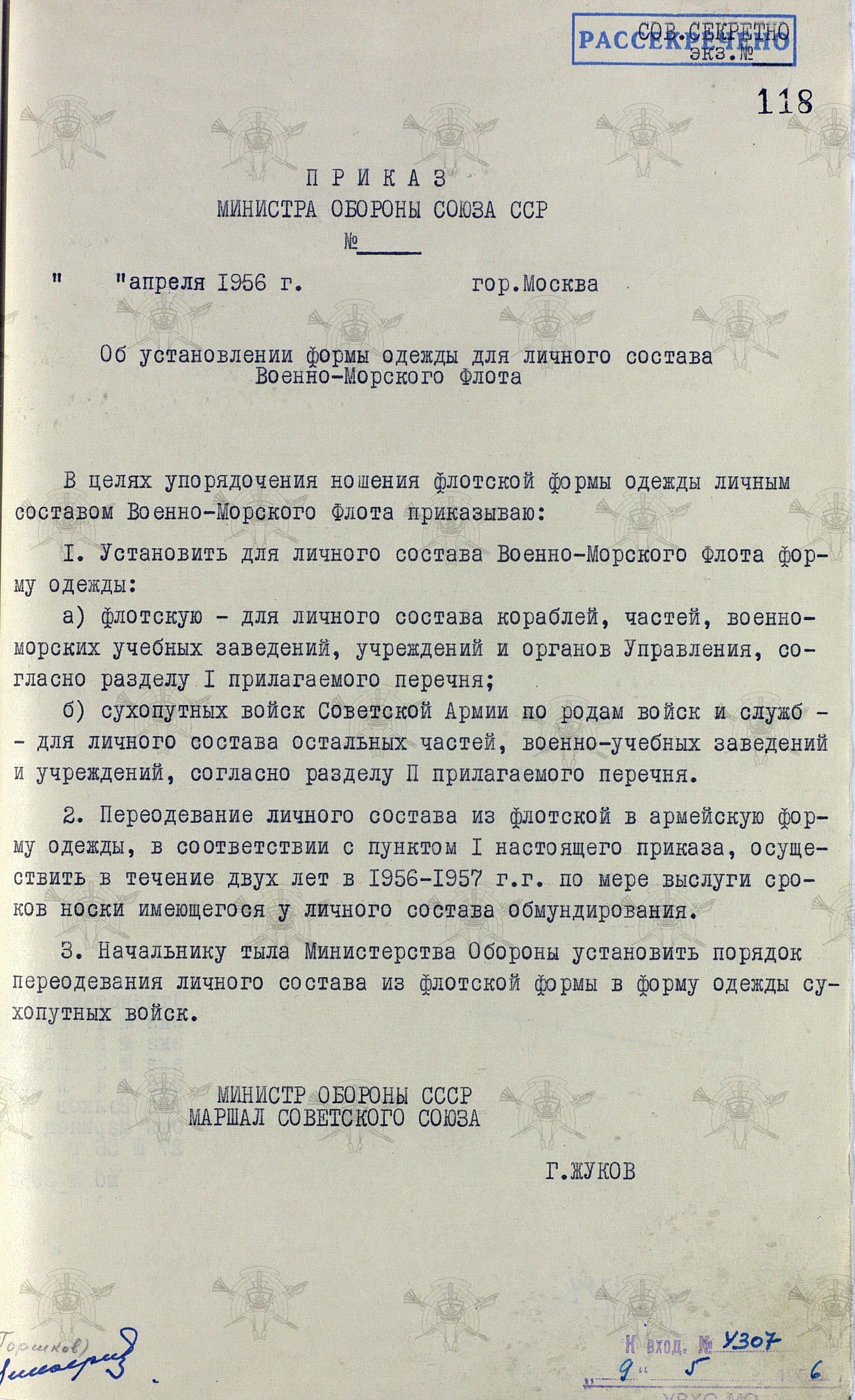 А итогом стали: доклад на имя заместителя Министра обороны СССР маршала И. Х. Баграмяна, с приложением перечня форм одежды, устанавливаемых для личного состава ВМФ и доклад Министру обороны СССР маршалу Советского Союза Г. К. Жукова, к которому прикладывалась позиция адмирала Сергея Георгиевича Горшкова.