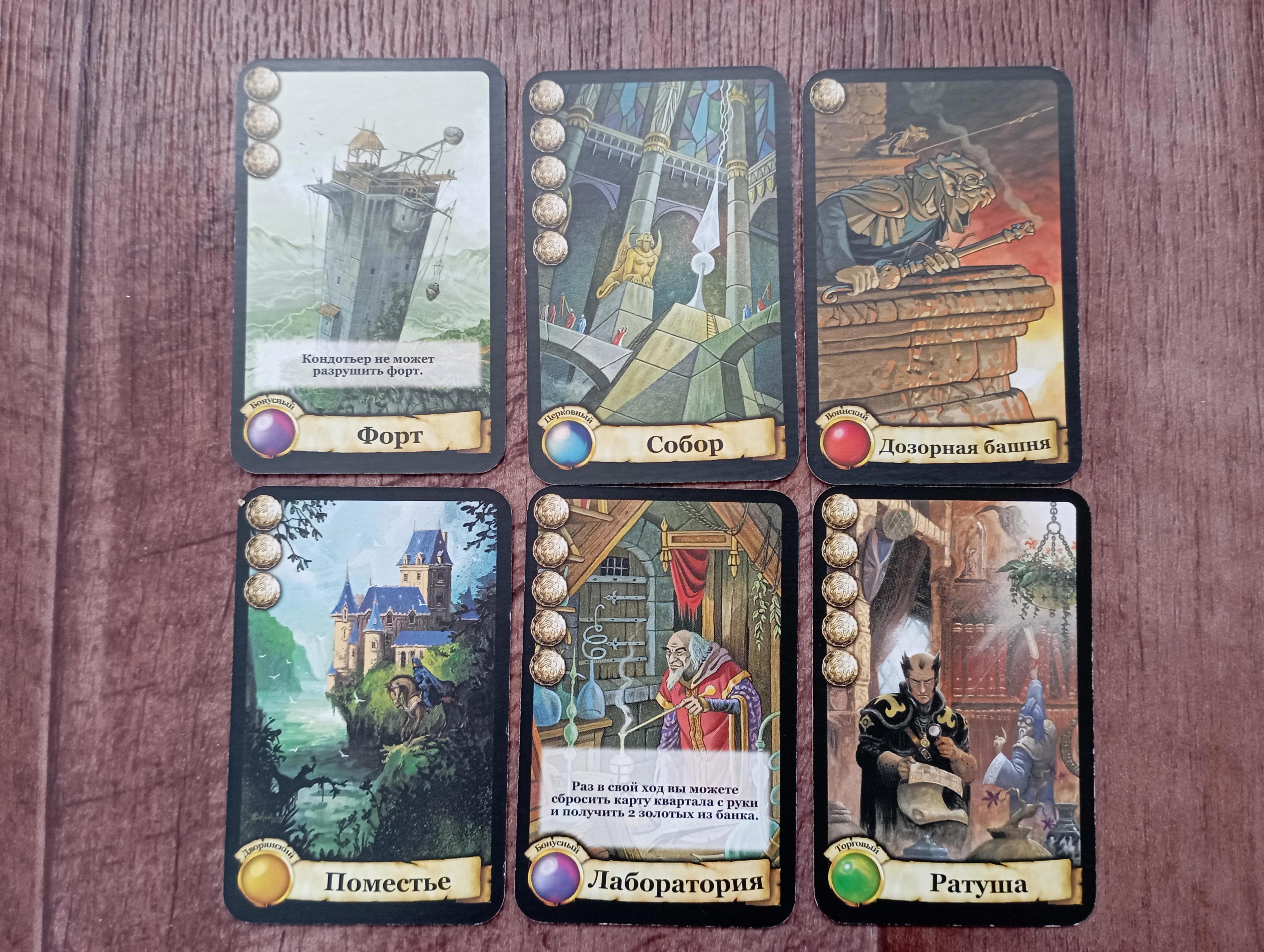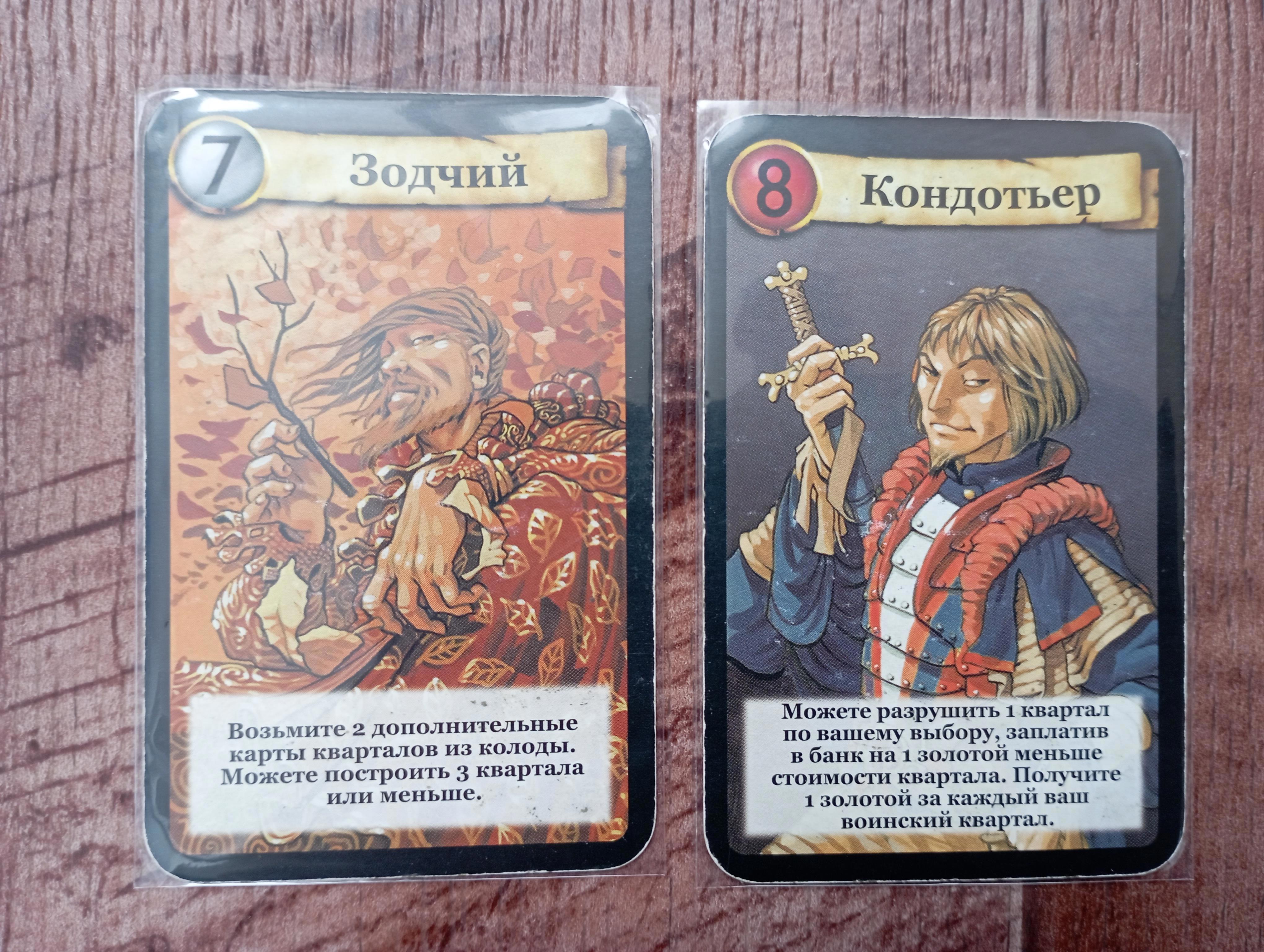 ️ Быстро изнашиваются карты персонажей. Нагрузка на карты очень неравномерная: кварталы только достают из колоды или просто кладут перед собой, а вот персонажей постоянно тасуют, передают по рукам и т.д. К тому же кварталов много (и кое-какие повторяются), а персонажи — одни и те же. В результате кварталы почти как новые, а персонажи — подранные и замурзанные. А отдельно карты для "Цитаделей" не продаются... Так что если купите игру, сразу защитите персонажей: или заламинируйте, или найдите для них какие-то защитные пакетики.