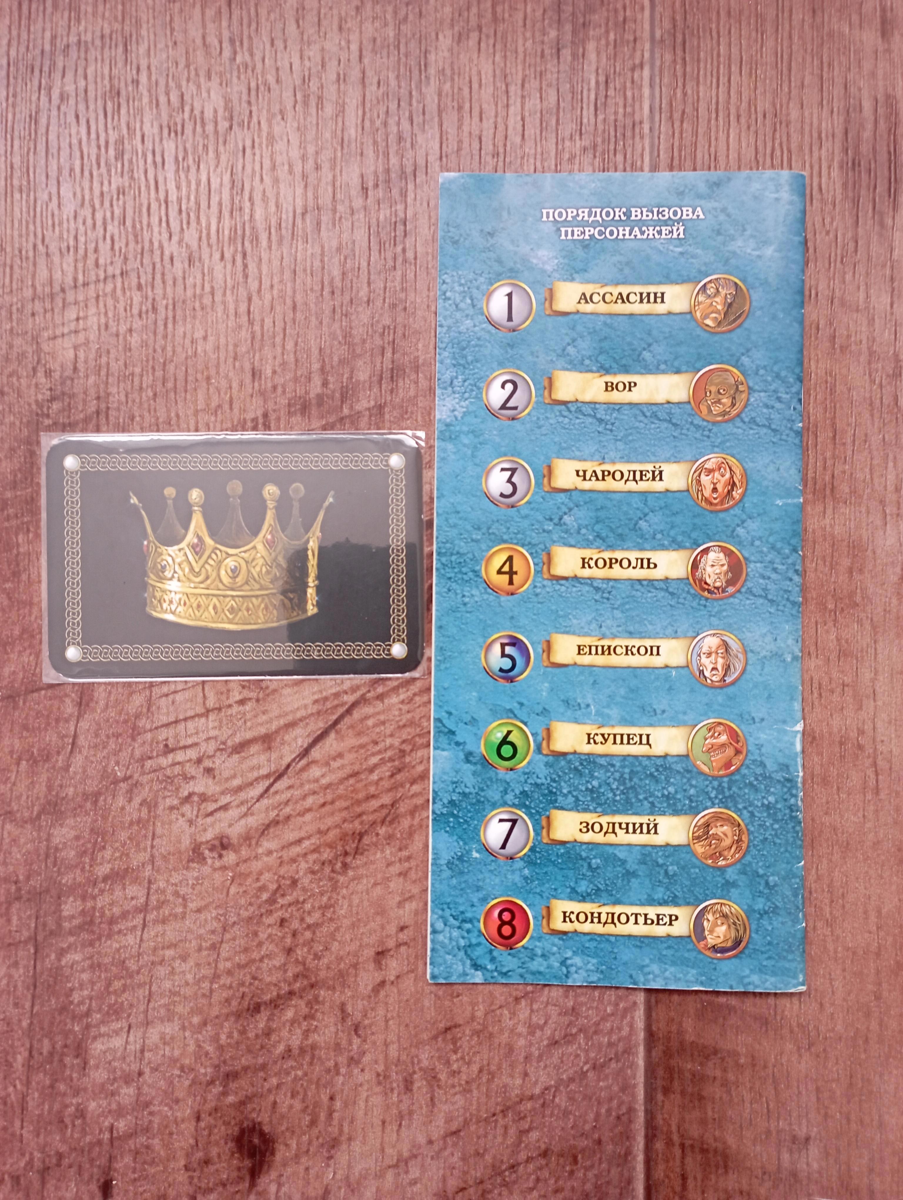 - карточка с короной. Нужна, чтобы игроки не забыли, кто перемешивает карты и первым выбирает персонажей на новый раунд.