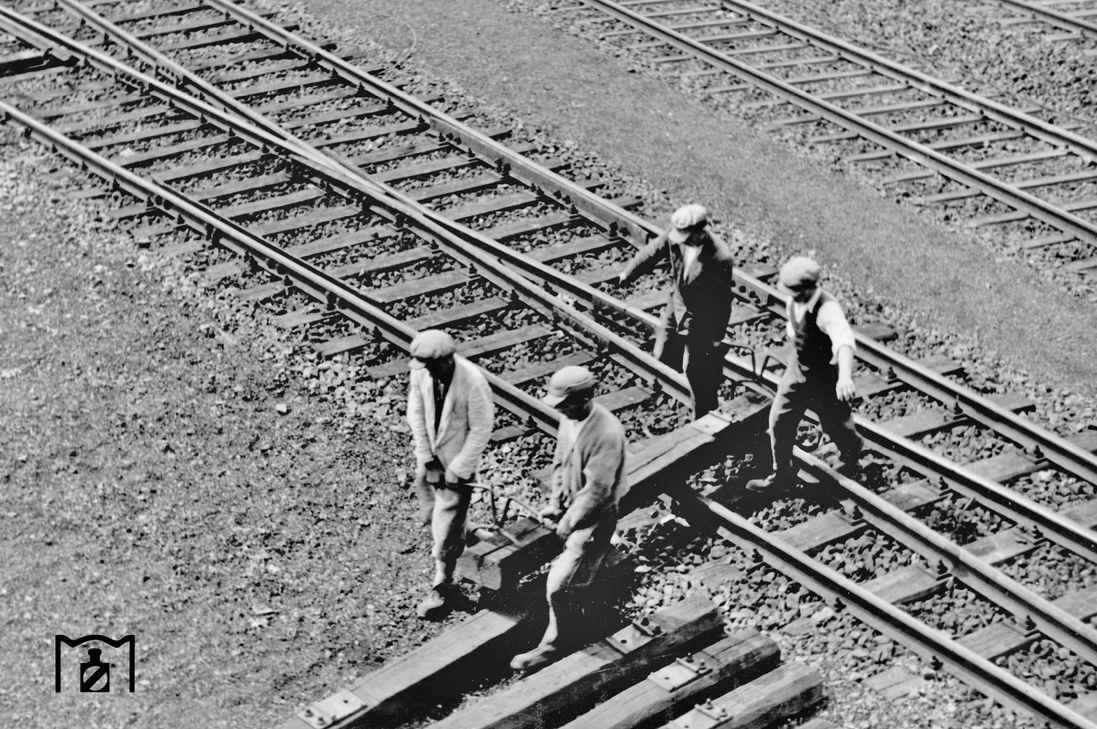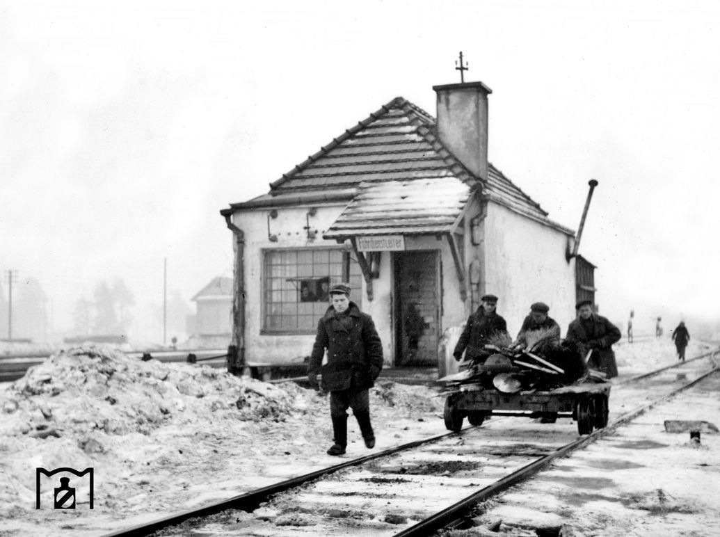 Железнодорожный узел Бобринская (сегодня: им. Шевченко) на магистрали Киева/Фастов - Цветково - Знаменка - Днепропетровск - бригада железнодорожного мастера с тележкой. Станция дорожной службы была, вероятно, новым зданием немецких оккупантов. (01.1943) Foto: RVM (Bandelow)