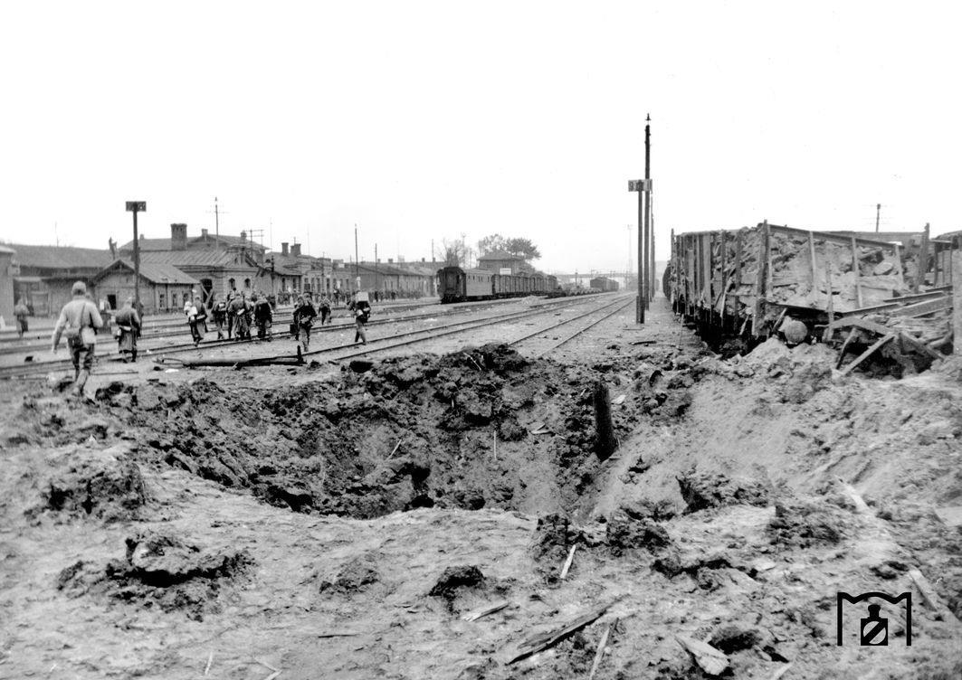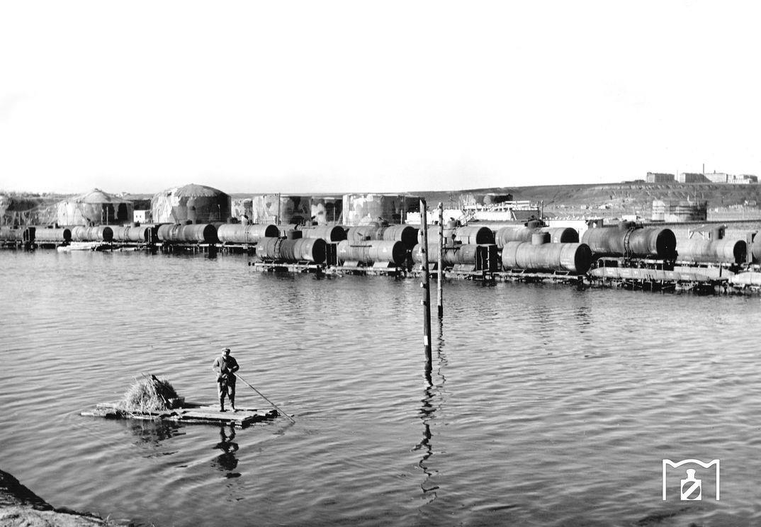 После таяния весной 1942 года не только цистерны, но и пути станции Полтава находилась под водой. Вода чуть выше края рельса, но фотограф знает, как использовать место для себя и дал картину более значимой, поместив местных жителей на плот. Если вы присмотритесь, деревянный плот лежит на трассах и, следовательно, не может плыть Итак, фото явно постановочное. (1942) Foto: RVM (Schuster)