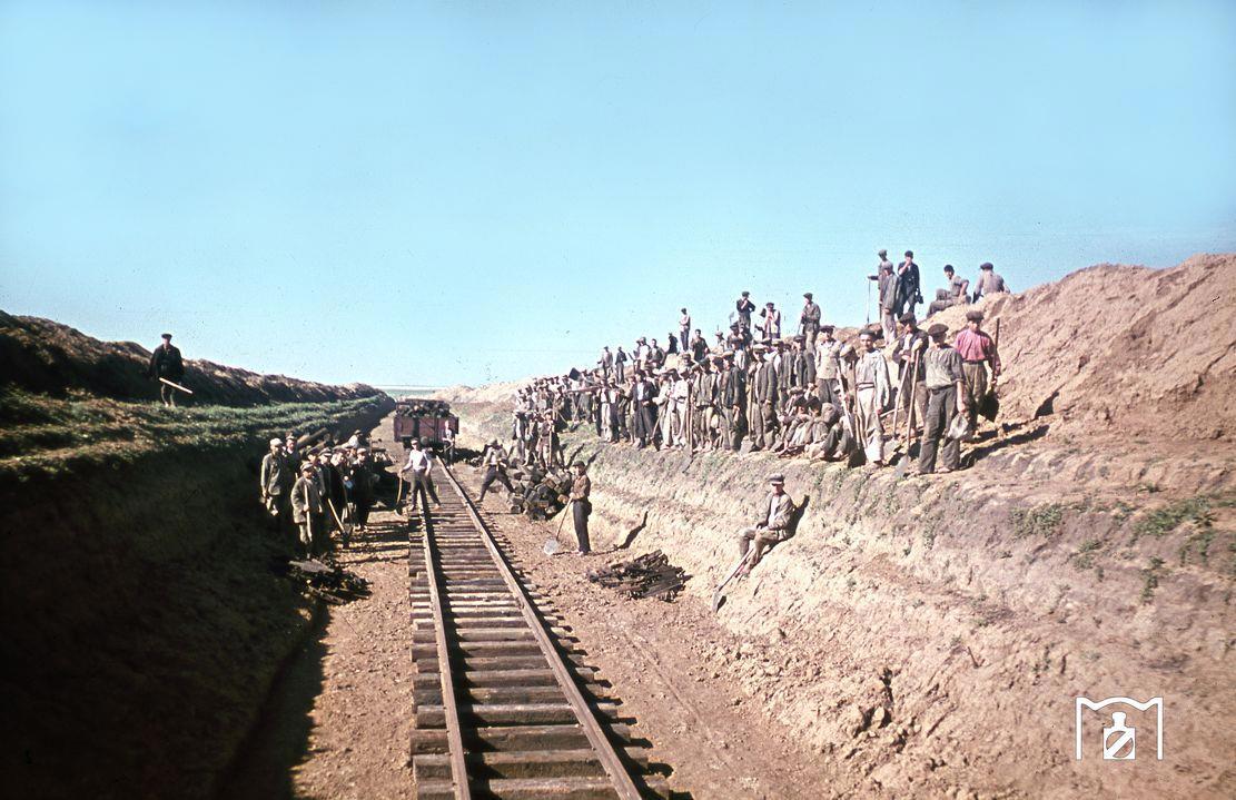 Помимо изменения колеи на стандартную колею, судя по всему, были также полностью перестроены маршруты. Немецкие оккупанты использовали местное население, которому порой приходилось рыть рвы целиком вручную, используя самые примитивные инструменты. (08.1943) Фото: Walter Hollnagel