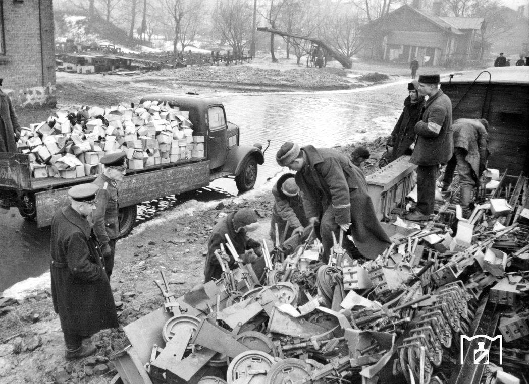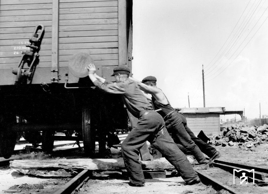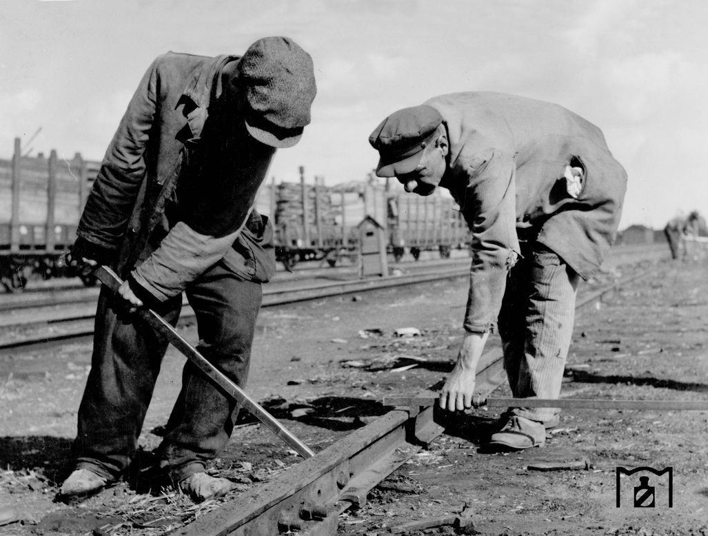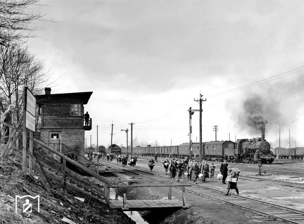 Местные рабочие переносят разбитые шпалы на минском вокзале. На станции также хорошо видны пути и стрелки, полностью переделанные с российской широкой колеи (1524 мм) на немецкую (1435 мм). 30 апреля 1942 года Управление транспорта Рейха (RVD) сообщило о 15 975 км путей с измененной колеей на востоке. В период своего наибольшего расширения осенью 1942 года около 750 000 железнодорожных рабочих и местного вспомогательного персонала с 4600 локомотивами использовались на железных дорогах протяженностью около 35 000 км в оккупированном Советском Союзе. Это соответствовало трети всей советской сети. (1943 г.) Фото: RVM (Korte)