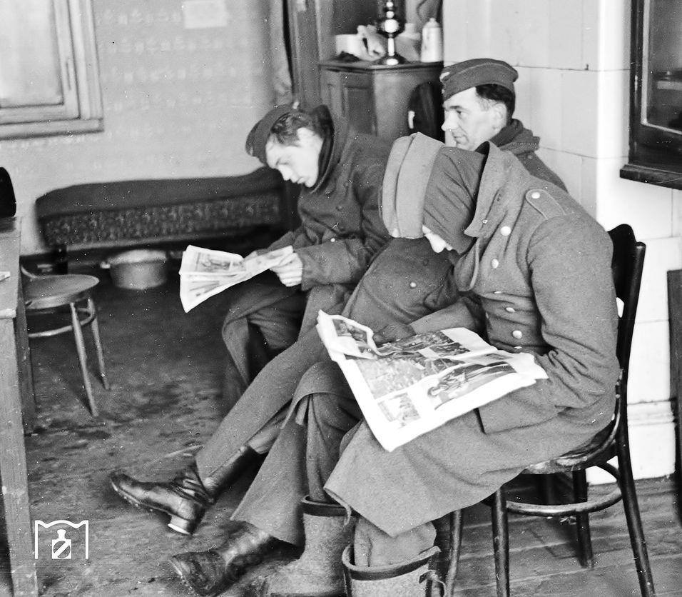 Солдаты в ожидании на вокзале Днепропетровска, которые счастливы, что нашли теплое место при экстремальных зимних температурах. Покой скоро закончится. После провала операции "Цитадель", последнего немецкого наступления на Востоке недалеко от Курска в июле 1943 года. Советское летнее наступление началось 26 августа 1943 года, положившее начало освобождению Украины Красной армией, включая Днепропетровск. (01.1943) Фото: Prof. Wolfgang Reisewitz