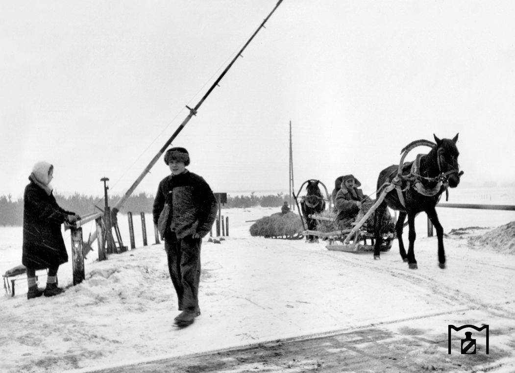 Зима. Железнодорожный переезд в Украине. Молодая девочка стоит со своими санками у открытого шлагбаума, в то время как двое упряжек саней пересекают железнодорожный переезд. Сани были оптимальным средством передвижения в это время года. (1943) Foto: RVM (Bandelow)