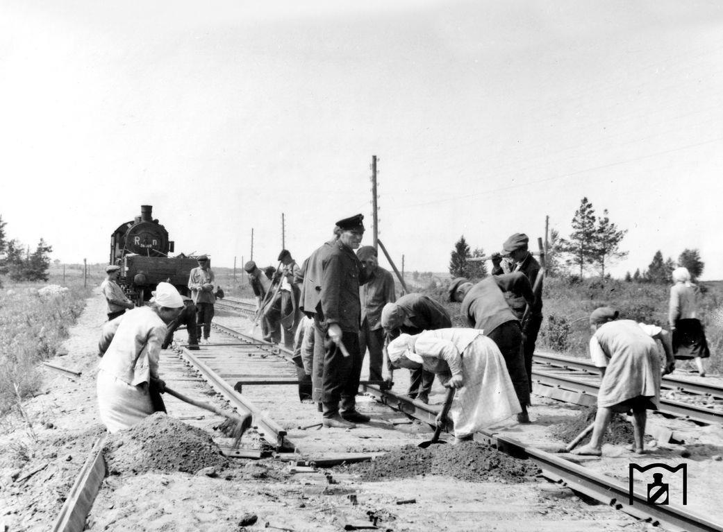 Работа Розиттенского отдела технического обслуживания железных дорог с латвийскими вспомогательными силами, которые в основном состоят из женщин. На двухстороннем участке Дюнабурга - Розиттен меняются рельсы и шпалы . На заднем плане паровоз 56 769 '' из BW Rositten («RN») . Он больше не вернулся домой, остался в Советском Союзе в 1945 году. (1942) Фото: RVM (Korte)