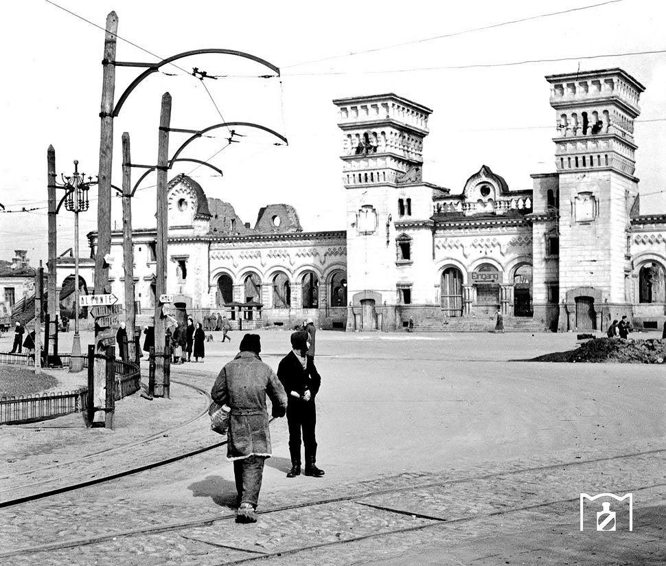 Днепропетровский вокзал. Если присмотреться, то можно увидеть, что только внешние стены станции пережили немецкое вторжение неповрежденными. Во время немецкой оккупации фасад даже начали перестраивать. Далеко они не продвинулись, и осенью 1943 года Красная Армия отбила город.(01.1943) Фото: Prof. Wolfgang Reisewitz