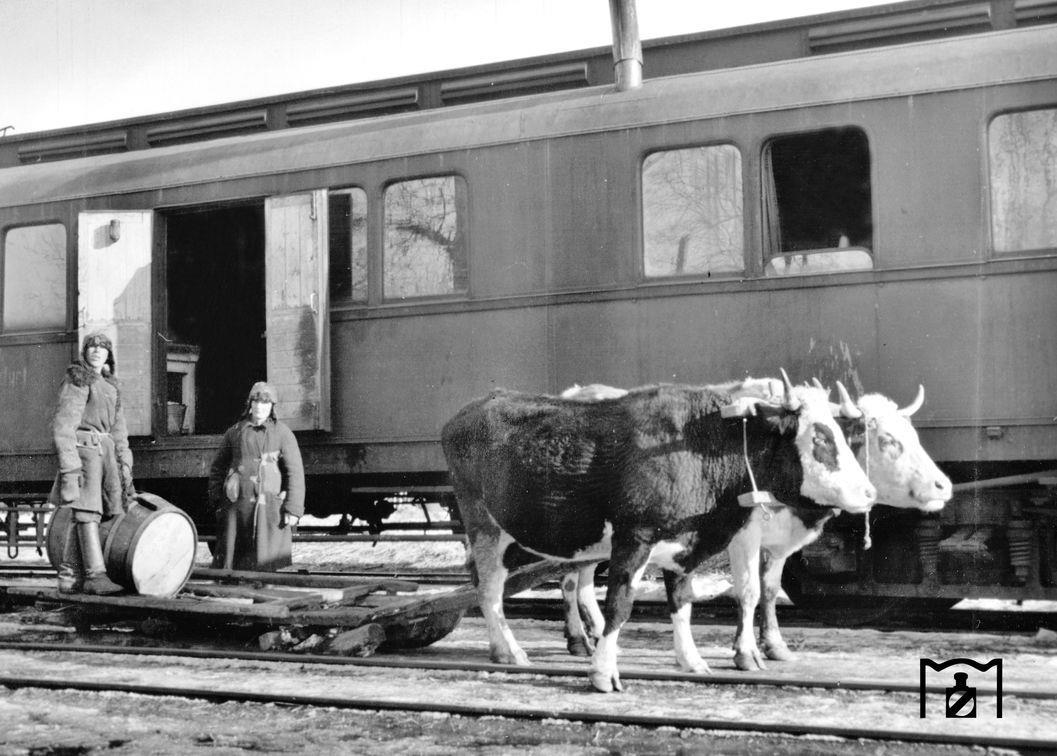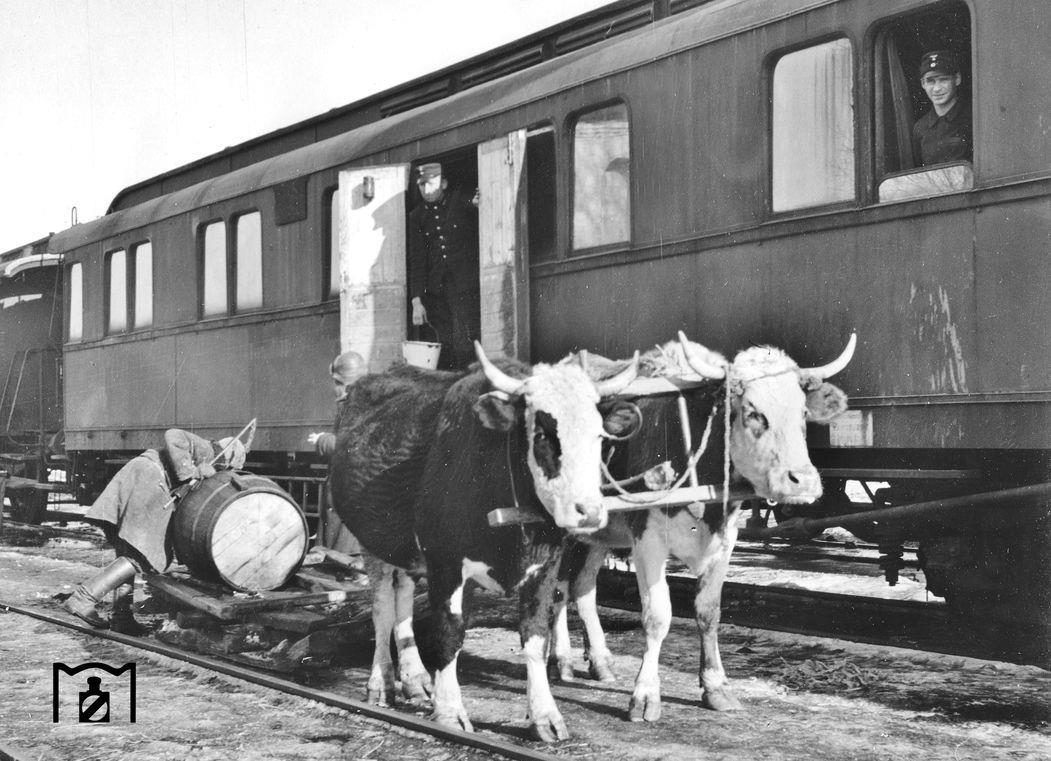 Зимой 1941/42 года простая упряжка быков подвозила питьевую воду в бывший прусский спальный вагон, переоборудованный в вагон-кухню и дежуривший где-то на Украине. (1942) Foto: RVM (Steiner)