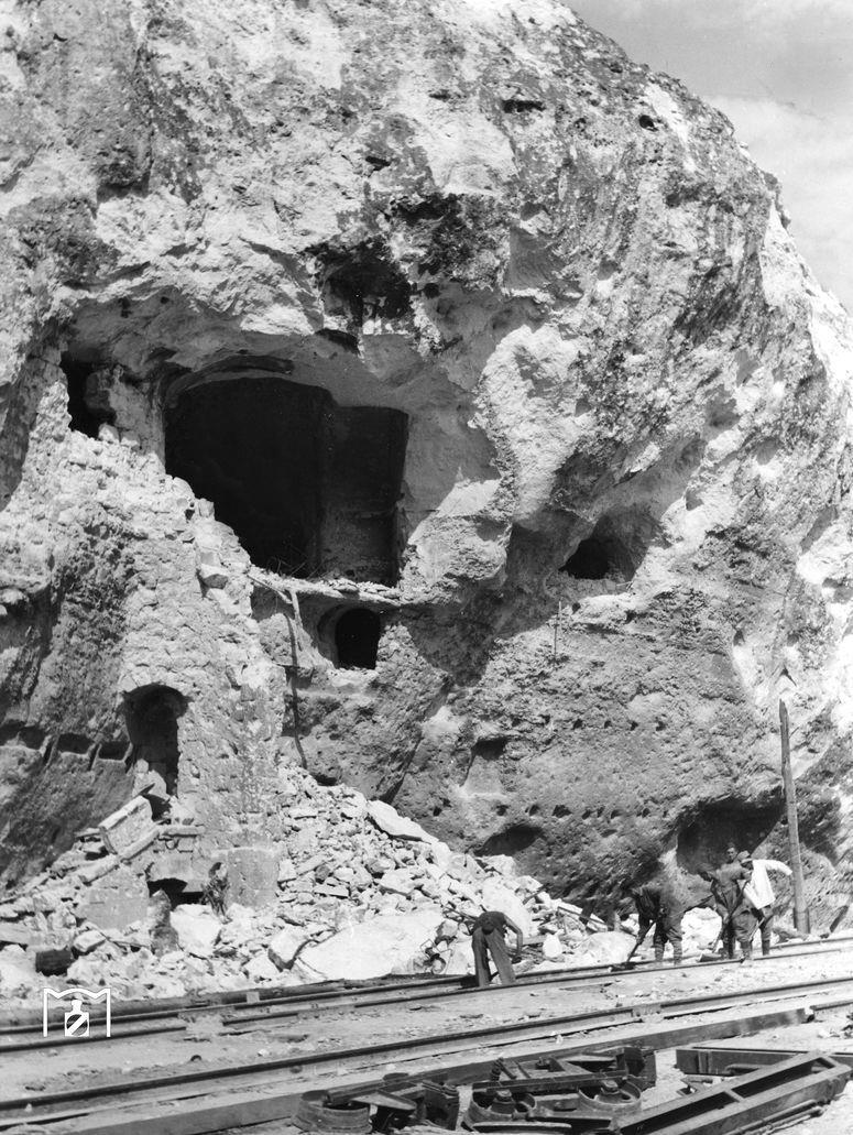 Восстановление линии и капитальный ремонт путей под Инкерманом на участке Симферополь-Севастополь Крыма. Инкерман известен пещерным монастырем Святого Климента, построенными друг на друге, с высеченными в скале пещерными жилищами, находившимися над железнодорожной веткой. Пещеры были созданы в VII-IX веках византийскими монахами. (1943 г.) Фото: RVM (Hollnagel)