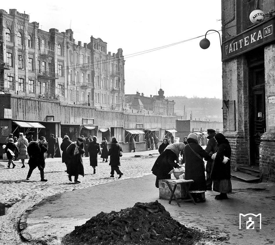 Сцена на рынке в Киеве. Во второй битве за Киев город был освобожден Красной Армией 6 ноября 1943 года после 778 дней немецкой оккупации. В городе находился (до 1954 года) лагерь для военнопленных № 62 для немецких военнопленных, а также госпиталь для военнопленных № 3201. Имелось несколько кладбищ для военнопленных, крупнейшее севернее город с около 20 000 похороненных. (1942) Фото:Prof. Wolfgang Reisewitz
