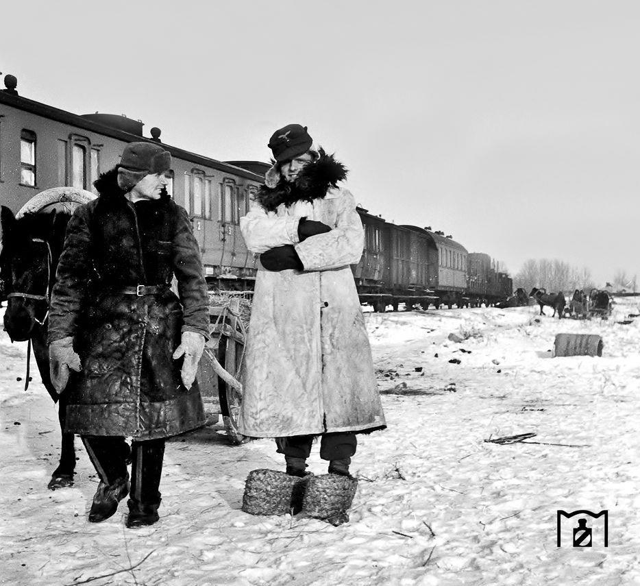 Поставки к стоянке поезда в Днепропетровске. Хотя немцы поначалу во многом смеялись над отсталостью Советского Союза, стало очевидно, особенно зимой, когда температура была экстремальной, что снабжение санями запряженными лошадьми, работало лучше, чем с помощью грузовиков, карбюраторы которых выходили из строя при низких температурах. (01.1943) Фото: Prof. Wolfgang Reisewitz