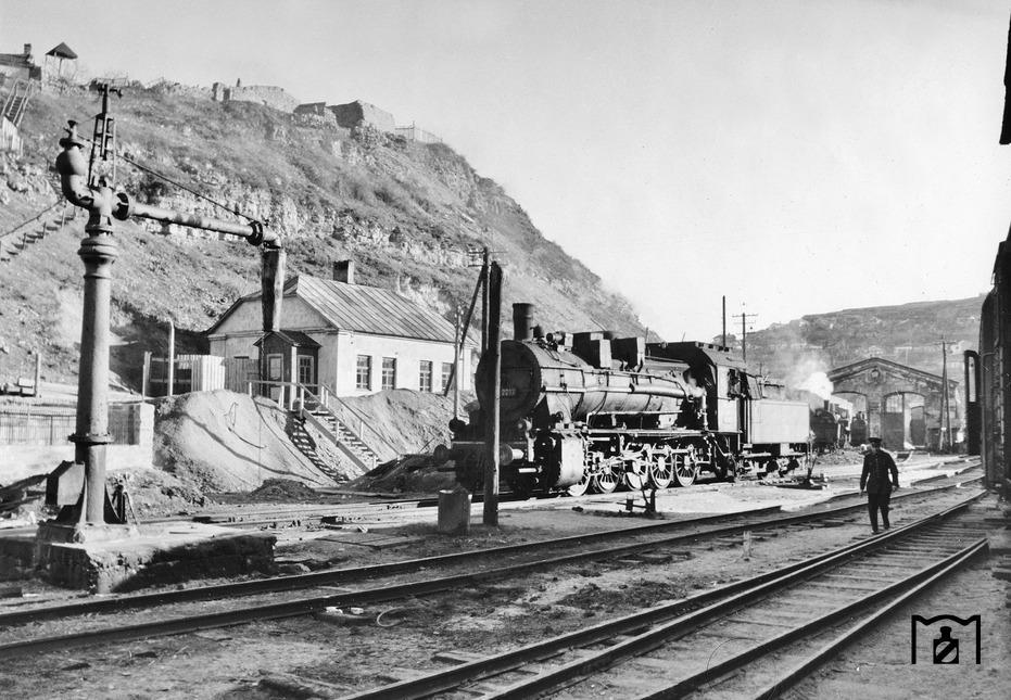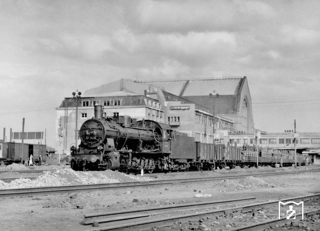 57 2430 проходит с грузовым поездом станцию Киев-1-пассажирский которая находится в реконструкции, а затем была переименована в Киев-пассажирский. Название станции все еще на украинском языке. Локомотив приписан депо Фастов-1 и связан с "3 T 20.2"-тендером баварского дизайна. 19 ноября 1941 года он был направлен из Хузум в Восточную миссию, после того, как ранее служил на датских государственных железных дорогах (DSB) в Аархусе и Фредеринии. В марте 1944 года 57 2430 вернулся с востока на станцию Буххольц (Харбург), откуда он снова был отправлен на войну в августе 1944 года, на этот раз на Западный фронт. Локомотив пережил конец войны и был возвращен в депо Карлсруе. Ездил до 1950 в Саарбрюкен и был списан в 1958 году.(1942)Foto: RVM (Ittenbach)