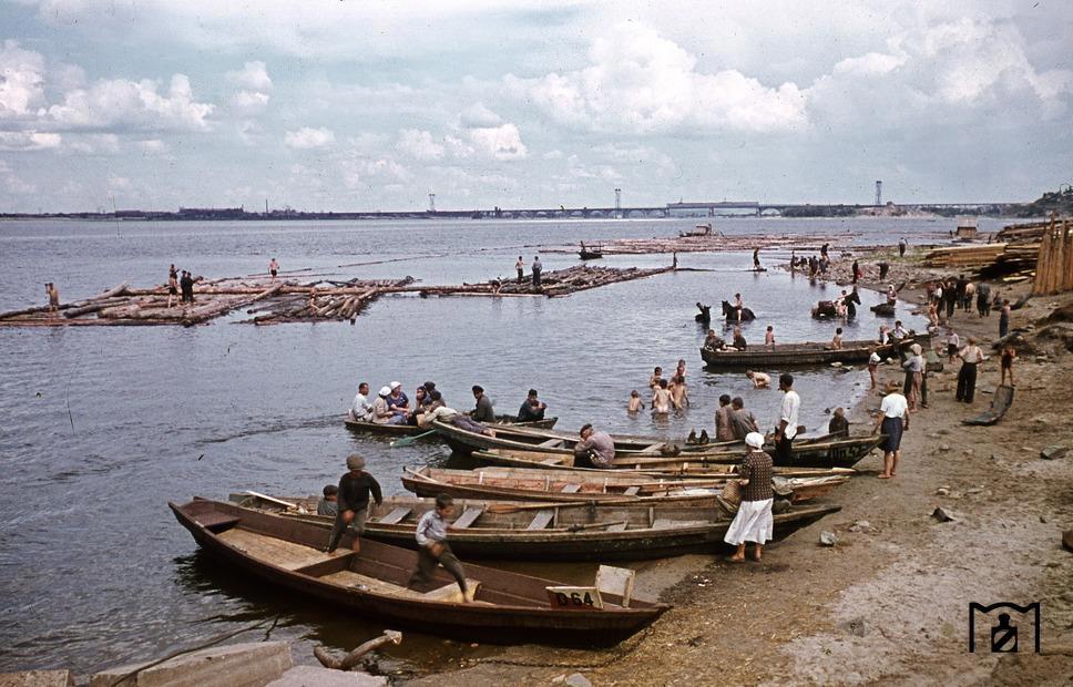 Лето на берегу Днепра. Казалось бы, беззаботные дети плещутся на лошадях между рыбаками и плотовщиками в освежающей воде. На заднем плане виден впечатляющий железнодорожный мост Мерефо-Херсон в Днепропетровске, построенный между 1914 и 1932 годами. (08.1943)Foto: Walter Hollnagel