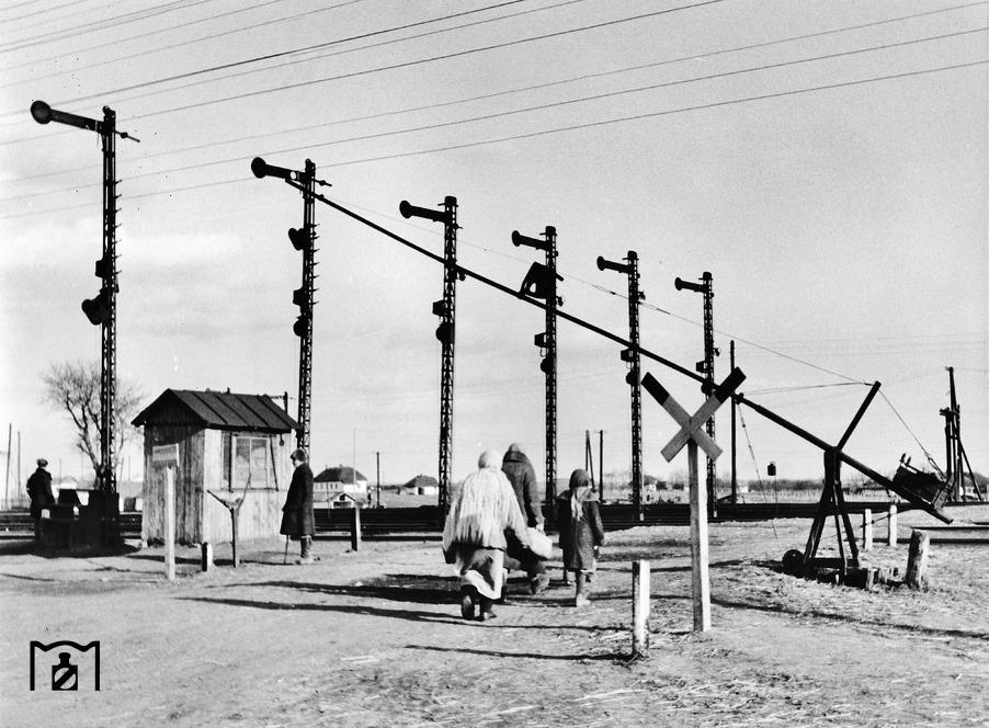Этот железнодорожный переезд в Украине был огражден простым шлагбаумом. Серия (новых) немецких семафоров выхода является образцовой. (1943) Foto: Walter Hollnagel