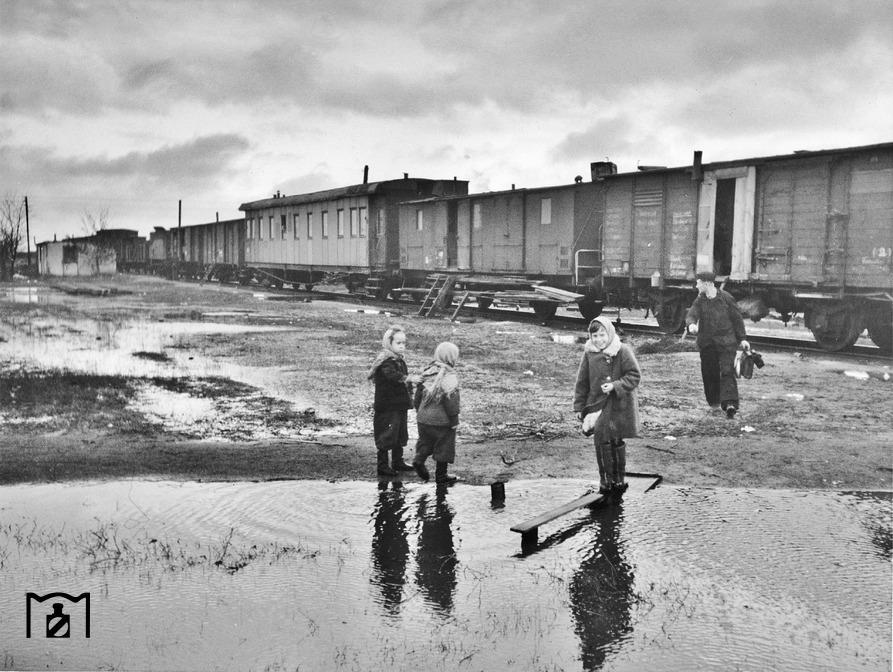 На железнодорожной станции Снигирёвка, примерно в 60 км к востоку от Николаева в Украине, дети играя в лужах. Сзади строительный поезд. (11.1943) Foto: Walter Hollnagel