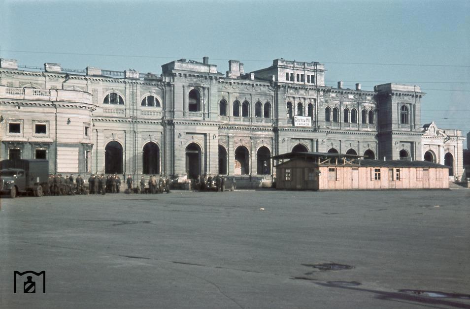 Во время Второй мировой войны Харьков подвергся тяжелым боям и понес много потерь. Город был очень важным стратегическим объектом не только из-за его центрального транспортного положения, но и из-за наличия там военной промышленности. Например, там были изобретены, разработаны и производились танки Т-34. С октября 1941 года, до мая 1942 года, четвертый по величине город Советского Союза был завоеван немецкими войсками, в мае 1942 года была, но провалилась попытка освобождения. Освободить удалось только в феврале 1943 года, но уже в марте 1943 года город вернулся к немцам после тяжелых сражений. Большая часть города были разрушены боями. Только после битвы при Курске город, наконец, был освобожден Красной Армией 23 августа 1943 года. Вальтер Холлнагель сделал этот цветной снимок вокзала Харькова весной 1943 года. (04.1943) Foto: Walter Hollnagel