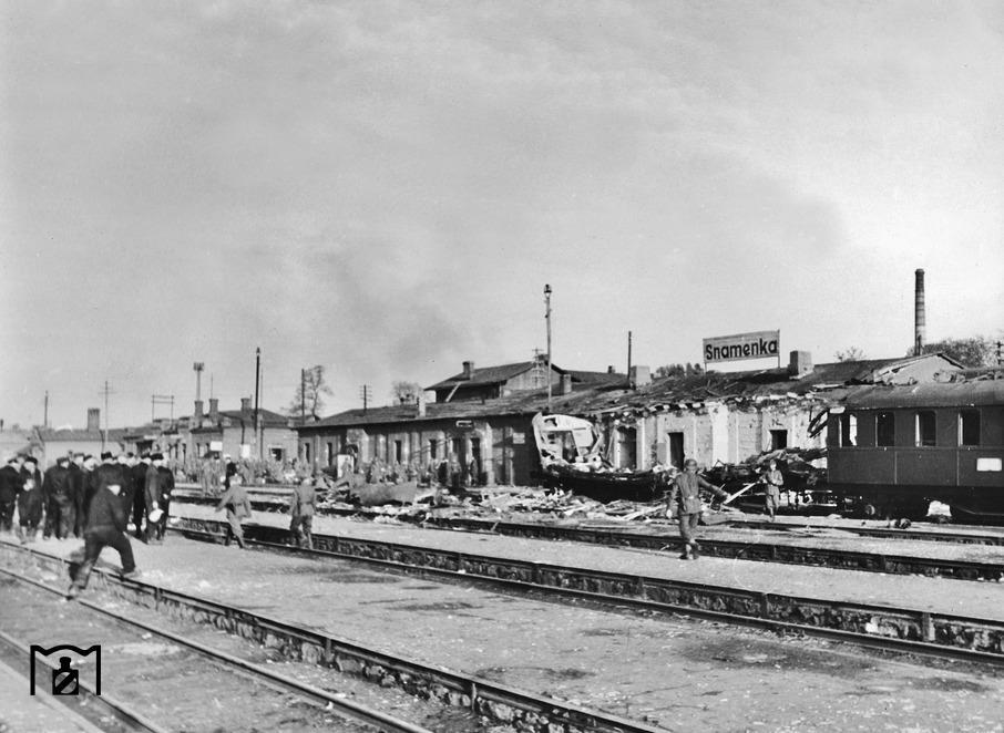 Тот факт, что предположительно слабый противник превратил в руины и пепел оккупированную российскую железнодорожную станцию Знаменка на Украине, включая санитарный поезд, совершенно не вписывался в пропагандистскую миссию РВМ по документированию достижений Рейхсбана в русской кампании. Фотография, сделанная случайно оказавшимся там фотографом гамбургского управления, была немедленно запрещена к публикации. (1943) Foto: Walter Hollnagel