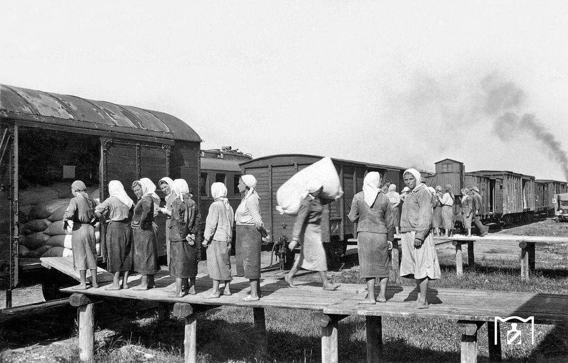 С завоеванием Украины немецким Вермахтом началась эксплуатация и угнетение населения. Украина имела статус колонии, которая должна была поставлять сельскохозяйственную продукцию (в том числе зерно, мясо, скот) в Третий рейх. Принудительное участие местного населения было упрощено термином «добровольцы», как показано в оригинальном названии этой фотографии. Впоследствии образ босых и плохо одетых женщин, которым, как всегда, приходилось разгружать вагоны с продовольствием на неизвестной станции («на Востоке»), вероятно, не подходил для пропагандистских целей и был заблокирован цензурой.(1942)Foto: RVM (Steiner)
