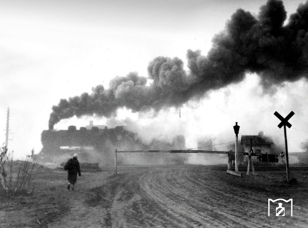 Локомотив польского производства TY 23 (DRB-Br 58.23) проходит по ровному пересечению в туманное утро в Знаменке в Украине. (1943) Foto: Walter Hollnagel