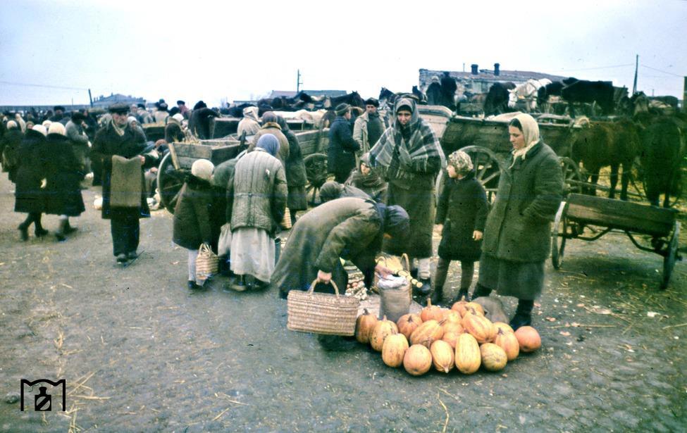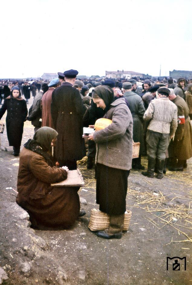 Украина считалась житницей Советского Союза задолго до Второй мировой войны. С завоеванием немцев началось разграбление сельскохозяйственных продуктов (зерно, мясо, крупный рогатый скот), которые должны были быть доставлены в третий рейх. В результате местное население снова пострадало от голода, как при Сталине. Все страдания местного населения также отражаются в некоторых полублагах, которое все еще были доступны на рынке в Киеве. (1942) Фото:Prof. Wolfgang Reisewitz