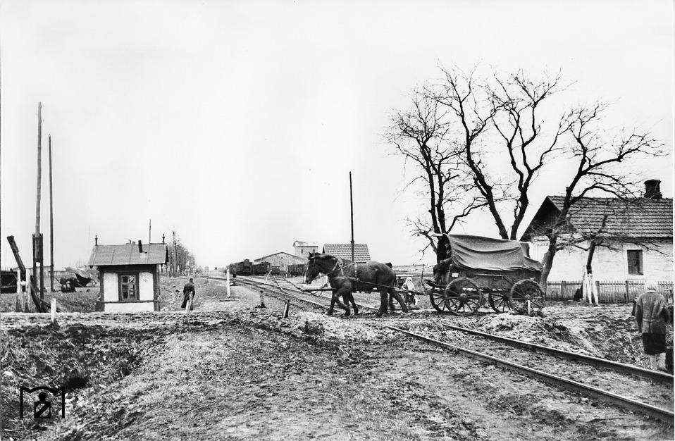 Судя по всему, на том же железнодорожном переезде, что и на предыдущем снимке, Вальтер Холлнагель в пасмурный ноябрьский день встретил эту повозку, запряженную лошадьми. Однако изменилась одна важная деталь: хотя машина, стоявшая слева на станции, еще летом была цела, теперь обломки на том же месте портят идиллию картины. (11.1943) Foto: Walter Hollnagel
