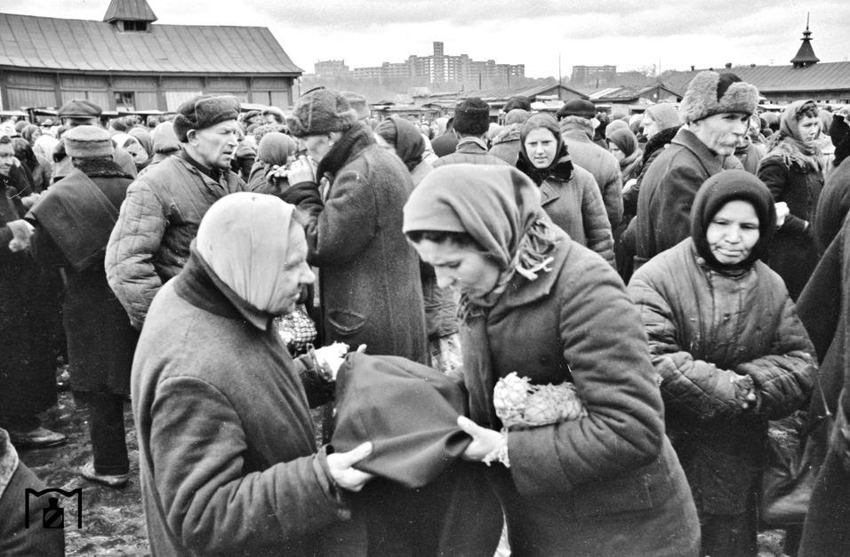 Доминирующее большинство женщин среди нескольких стариков обращает на себя внимание на центральном рынке Харькова. В этот момент молодые люди уже формировались для предстоящего летнего наступления, которое привело к окончательному освобождению города от немецких оккупантов. (04.1943) Foto: Walter Hollnagel