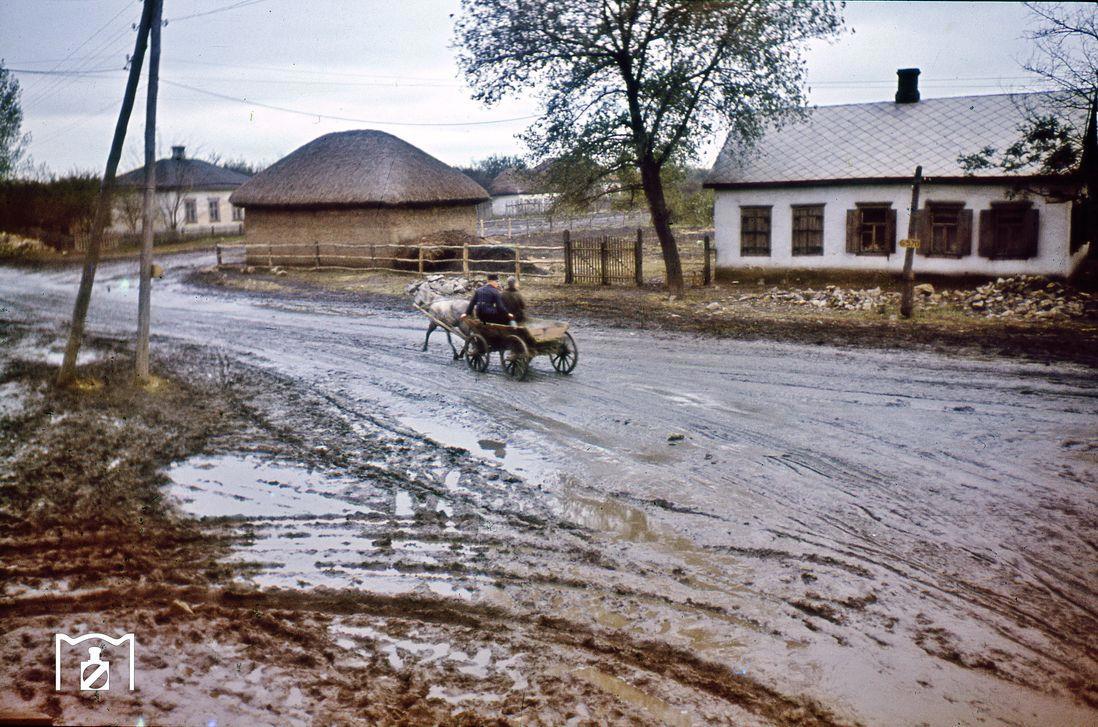 В маленьком городке Лубны, в 180 км к востоку от Киева, на железнодорожной линии, ведущей на Полтаву, в конце лета 1943 года начался печально известный период распутицы. Грунтовые дорожки и улицы затем превратились в настоящие грязевые пустыни, что тоже очаровало гамбургского фотографа-пропагандиста. Кстати, место Лубны стало известно благодаря железнодорожным конторам, таким как машинное отделение и эксплуатационная контора. На самой станции имелись железнодорожные мастерские и железнодорожная депо эксплуатационного обслуживания. Город был оккупирован немецким Вермахтом с сентября 1941 по октябрь 1943 года. (09.1943)Foto: Walter Hollnagel