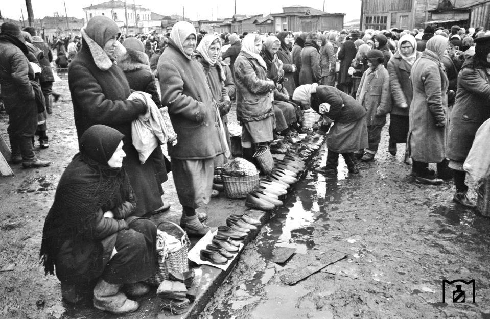 Импровизированная торговля обувью на Центральном рынке Харькова. (04.1943) Foto: Walter Hollnagel
