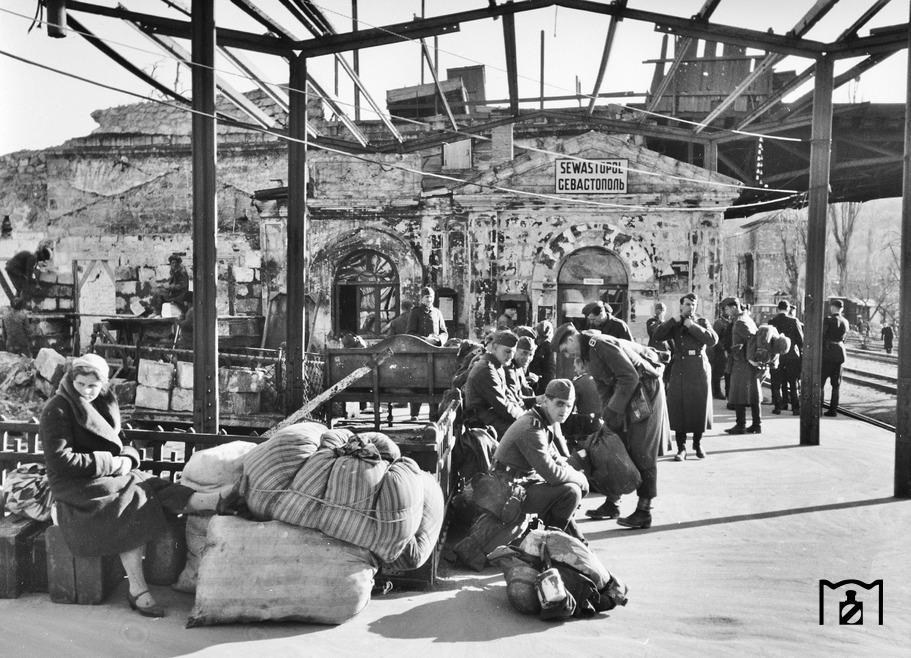 Даже спустя два года после боев за город-крепость Севастополь на вокзале все еще можно увидеть явные следы тяжело сражавшегося города. Немецкие солдаты ждут поезд, единственное (русское) гражданское лицо несколько смущается перед фотографом. (1943) Foto: Walter Hollnagel