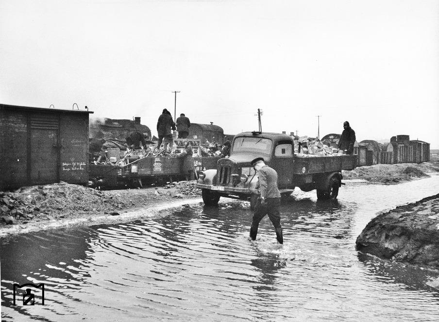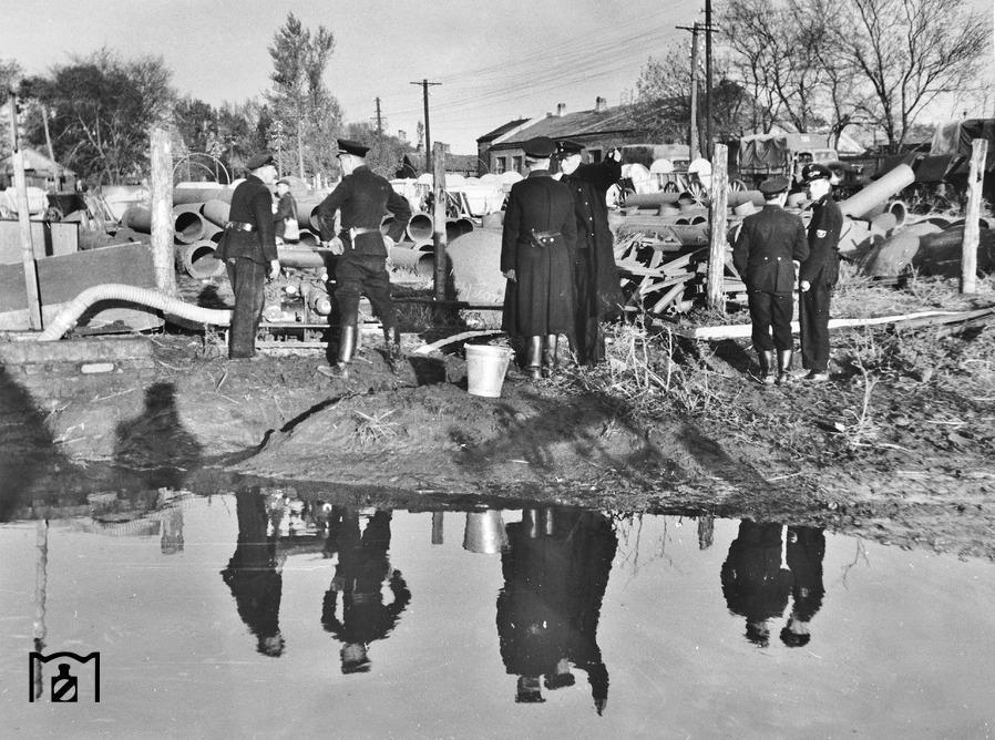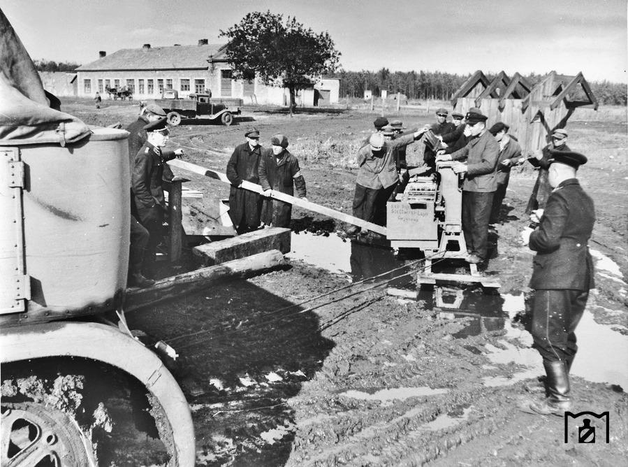 В дополнение к беспокойству о приближающемся фронте, дорожный мастер Уэшке (с вытянутой рукой) в кругу своих коллег должен прояснить, как убрать оборудование от растаявшей воды. В конце концов, насос уже используется.(1943)Foto: Walter Hollnagel