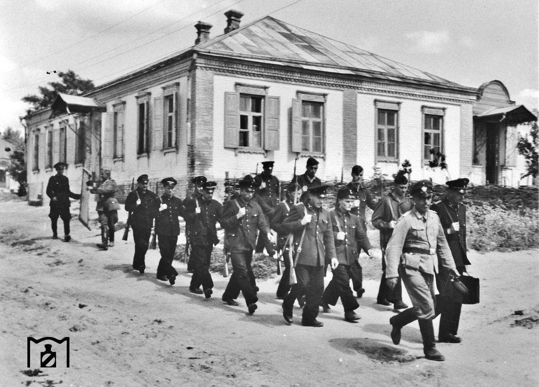 Железнодорожники в синей форме, несущие мишени и оружие, во главе с полицейским идут на стрельбище в Знаменке.(1943)Foto: Walter Hollnagel