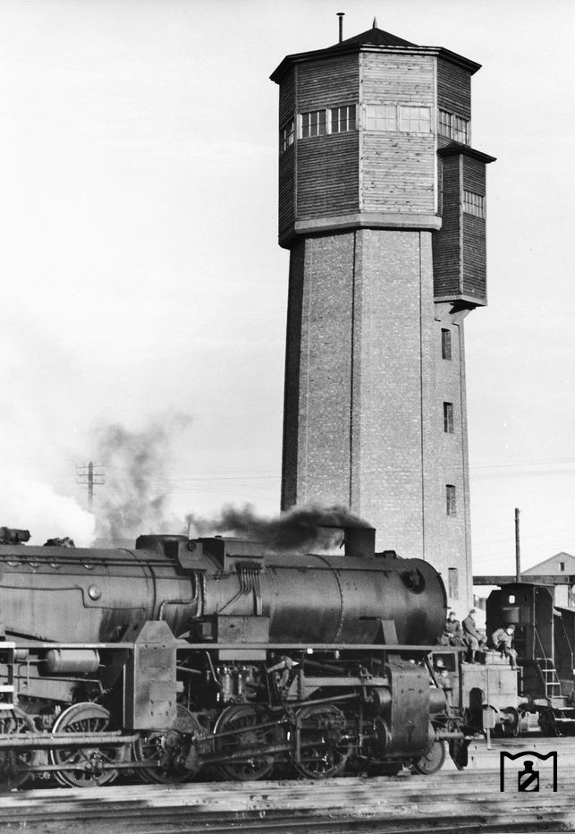 Совершенно новый 52 1893 перед поразительной водонапорной башней станции Николаев (Украина). Локомотивы, специально изготовленные для использования на Востоке, для регионов с низкой водой на юге Украины, не обеспечивали преимущества Рейхсбана, они просто опаздывали и присутствовали здесь только в течение полугода, пока Красная Армия снова не освободила этот район. (09.1943) Foto: Walter Hollnagel