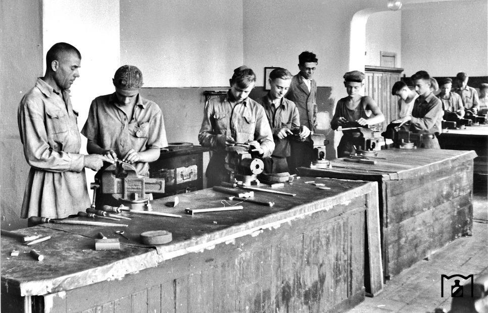 Функционирующая железная дорога требовала хорошо подготовленных молодых людей. Рейхсбану быстро стало ясно, что немецкие железнодорожники не могут выполнить огромную потребность в ремонте на Восточном фронте. В ученической мастерской РВД Бобринской молодых украинцев обучали правильному обращению с напильниками, чтобы потом их можно было трудоустроить в мастерской, например, слесарями локомотивов. (1943) Foto: Walter Hollnagel