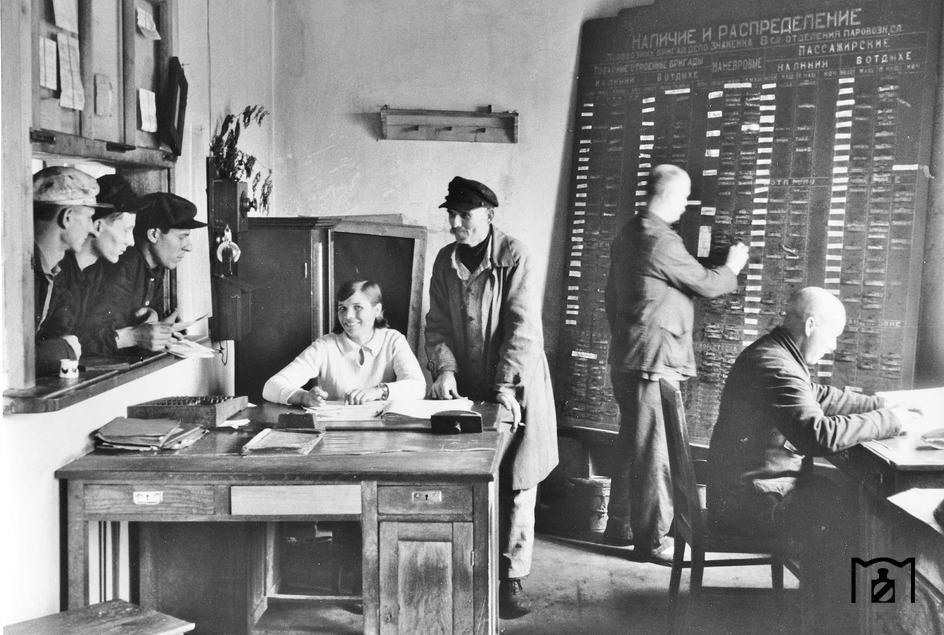 Когда появился фотограф, у локомотивного руководства на Бобринской было явно хорошее настроение. Все сотрудники — местные железнодорожники, которые могли выполнять свои обязанности в традиционной рабочей среде, но теперь работают по указанию Рейхсбана. С самого начала Рейхсбан зависел от сотрудничества местных рабочих. Для обеспечения связи между немецким и местным обслуживающим персоналом были изданы специальные многоязычные буклеты с технической терминологией железнодорожных операций. (1943) Foto: Walter Hollnagel