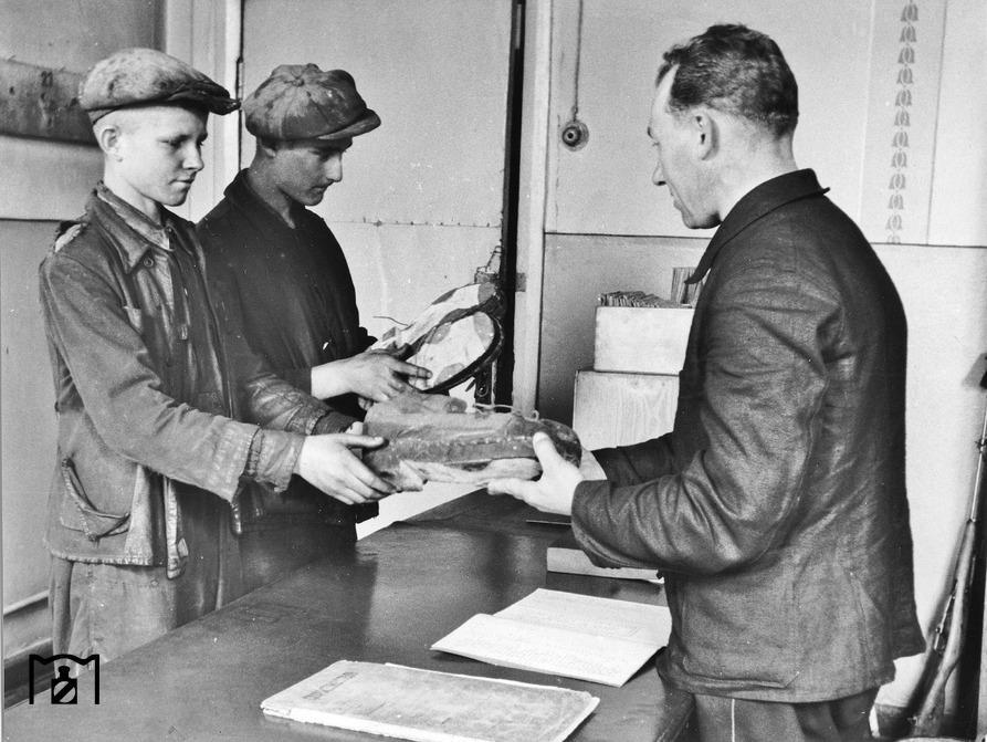В Бобринском материально-распределительном пункте местным помощникам выдают подходящую обувь для работы на Рейхсбане. Бедность, которая царила в Украине, особенно среди сельского населения, привела к тому, что многие люди, желающие работать, даже не носили обуви на ногах. Однако Рейхсбан не хотел позволять рекрутам увлекать себя чем-то большим, чем предоставлением самой простой обуви. Замена сильно изношенной спецодежды, вероятно, даже не планировалась. (1943) Foto: Walter Hollnagel