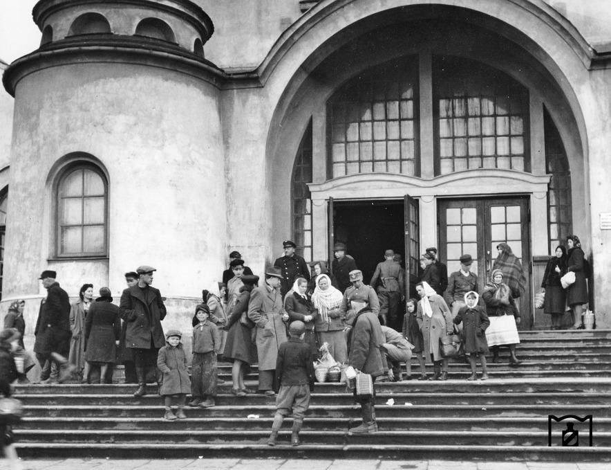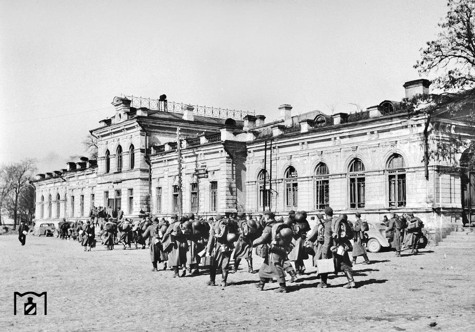 Поездки гражданского населения в оккупированных немцами восточных районах играли совершенно второстепенную роль, поскольку военным был отдан абсолютный приоритет.Таким образом, замысел этого фото перед железнодорожным вокзалом на Украине также остается неясным. (1943) Foto: Walter Hollnagel