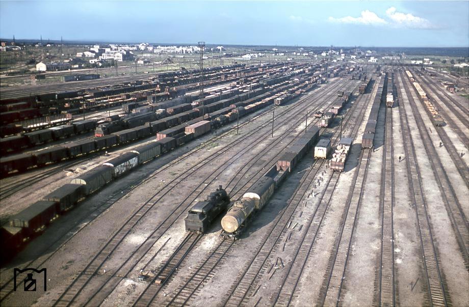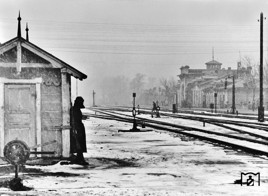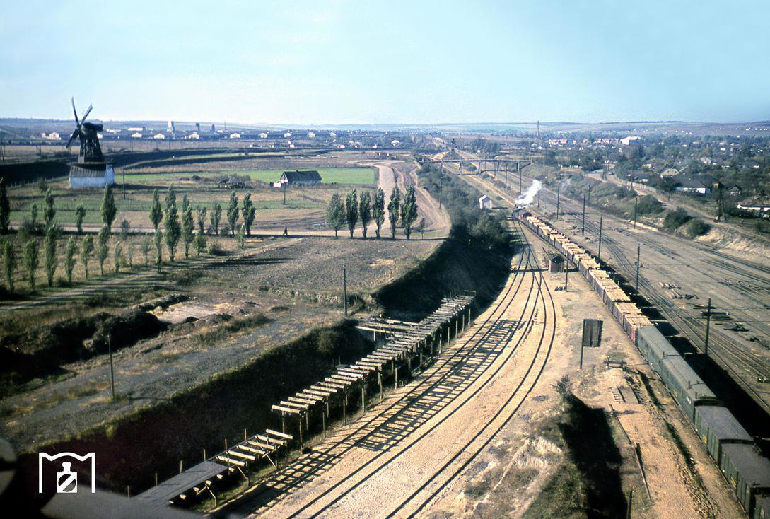 В железнодорожном узле Бобринская (ныне Им.Т.Шевченко) магистраль (Киев / Фастов) Цветково - Знаменка (-Днепропетровск) пересекает однопутную магистраль Гребенка - Возможная. Вальтер Холлнагель использовал высоту фонарного столба, чтобы задокументировать центральный выход со станции в западном направлении. Прусский G 71 (серия 55.0) стоит на выдвижном пути. Справа от него рельсовые пути ведут прямо в Цветково. Примерно в 300 метрах за эстакадой на расстоянии можно увидеть здание перекрестка. Здесь линия Гребенка / Черкассы, идущая с севера, проходит по большой дуге, через глубокую выемку вокруг ветряной мельницы, в южную часть вокзала. На сегодняшний день эта ситуация практически не изменилась, только ветряная мельница не выдержала испытания временем. (05.1943) Foto: Walter Hollnagel