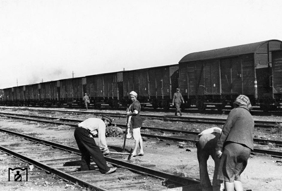 Тот факт, что женщины должны были выполнять физическую тяжелую работу, в частности, в оккупированных немецких районах, был ежедневной практикой. Особенно в повсеместном строительстве и ремонте, они запечатлены популярным фотографом RVM, как здесь, на неизвестной железнодорожной станции на Украине. (1942) Foto: RVM (Steiner)