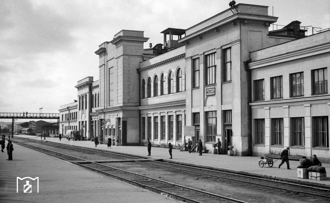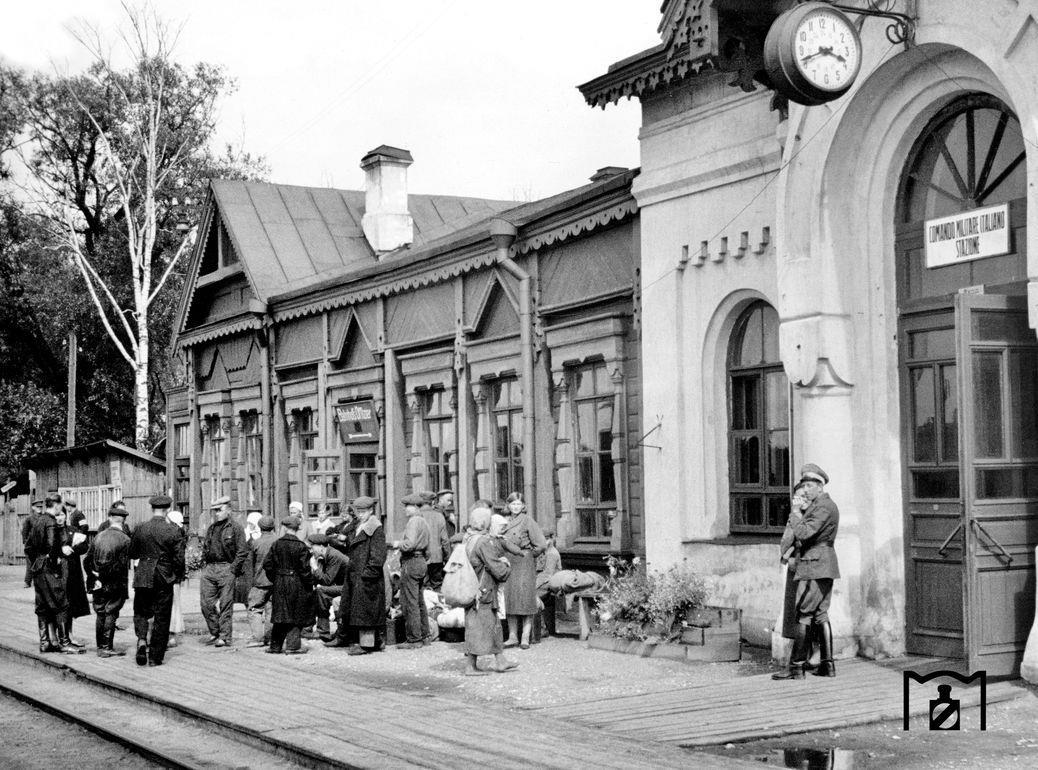 Вид на южный выход Винницкого вокзала в сторону Жмеринки. Название станции теперь отображается только на немецком языке, что безошибочно указывает на то, кто здесь главный (см. следующее фото). По пешеходному переходу можно было добраться до узкоколейной железнодорожной станции. Там начинался 200-километровый маршрут узкоколейки (шириной 750 мм) через Сятковцы до Гайворона, центра разветвленной узкоколейной сети в Центральной Украине. Пешеходный мост используется и сегодня, узкоколейная железная дорога была переделана на широкую русскую колею после войны. (1942)Foto: RVM (Schuster)