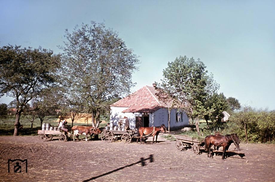 Снимок из окна поезда где-то в Украине: Фермеры доставляют бидоны с молоком в пункт сбора на вокзале. (07.1943) Foto: Walter Hollnagel